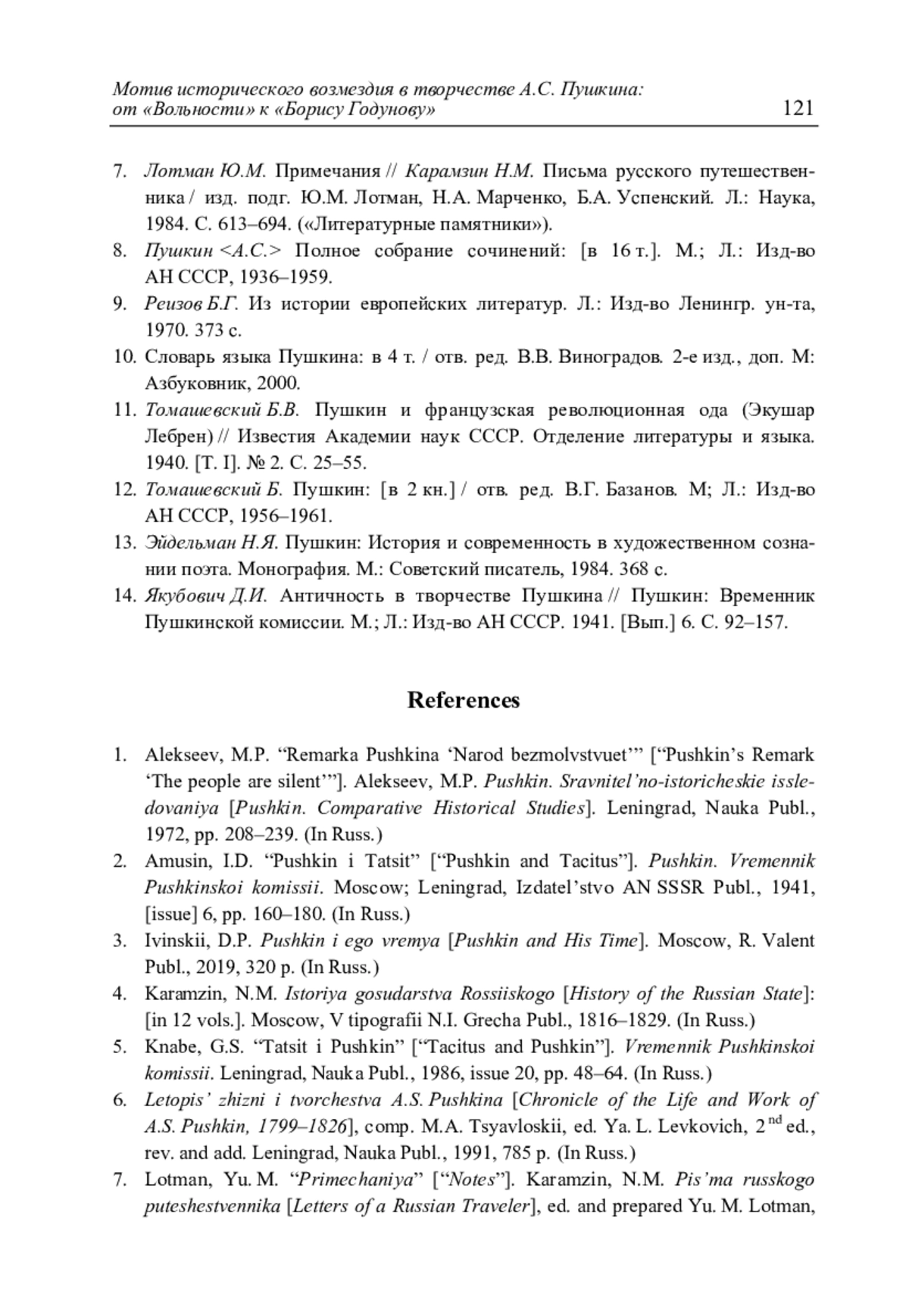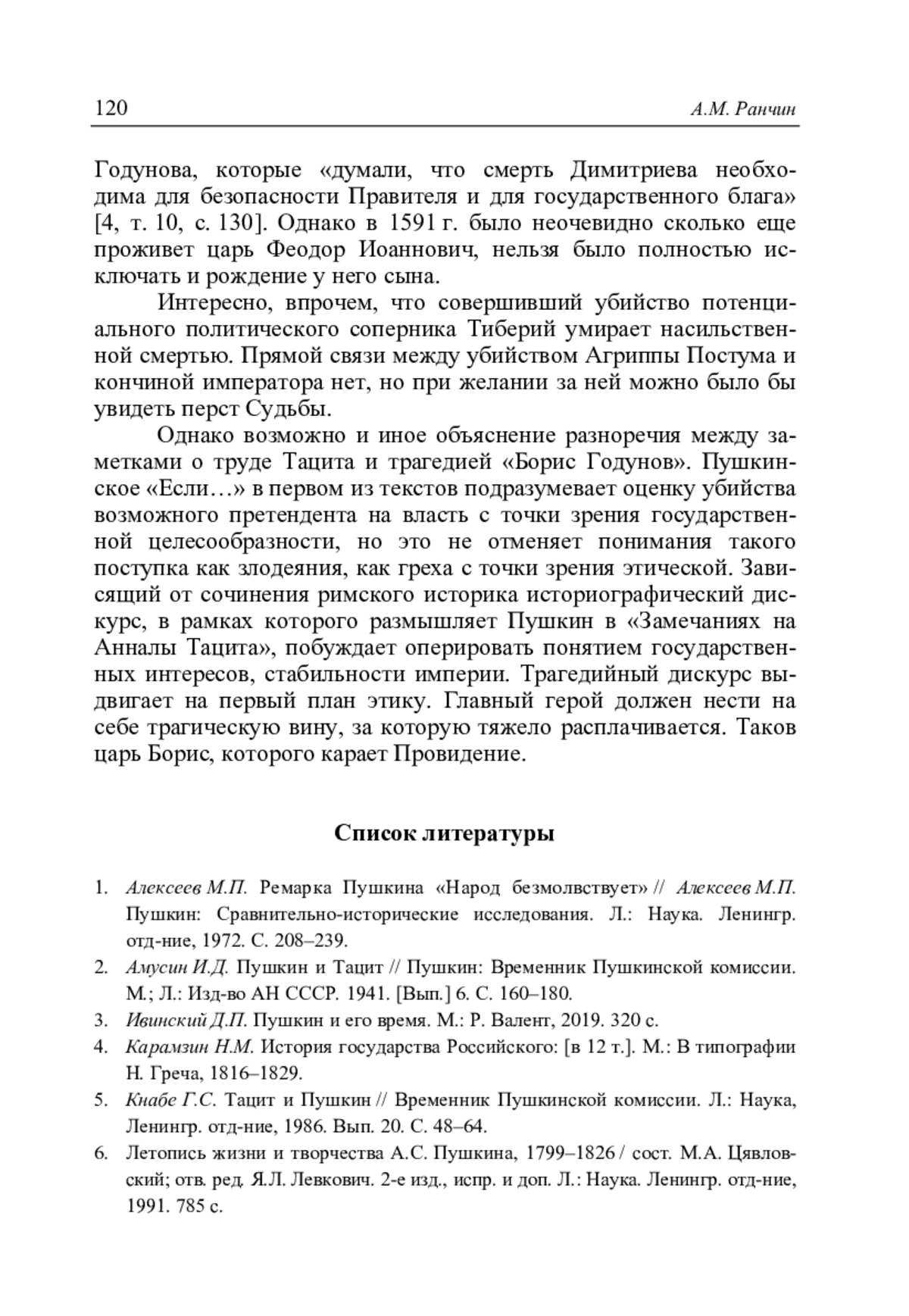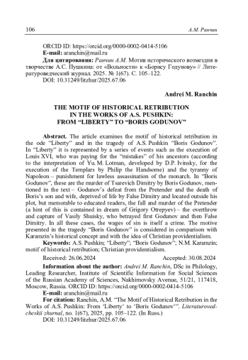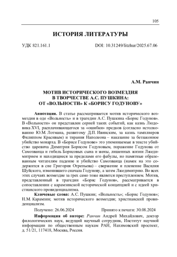 Ранчин А.М. Мотив исторического возмездия в творчестве А.С. Пушкина: от «Вольности» к «Борису Годунову» // Литературоведческий журнал. 2025. No 1(67). С. 105–122.