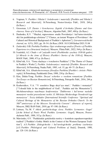 16. Matvienko, O.V. “Pushkinskie goticheskie motivy v kontekste zapadnoevropeiskoi traditsii” [“Pushkin’s Gothic Motifs in the Context of the Western European Tradition”]. A.S. Pushkin: filologicheskie i kul’turologicheskie problemy izucheniya