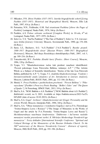 25. Shul’ts, S.A. “M.M. Bakhtin o A.S. Pushkine” [“M.M. Bakhtin about A.S. Pushkin”]. Bakhtinskii vestnik, no. 9, 2023. Available at: https://bakhtin.mrsu.ru/2023-%e2% 84%969/ (date of access: 03.03.2023). (In Russ.)