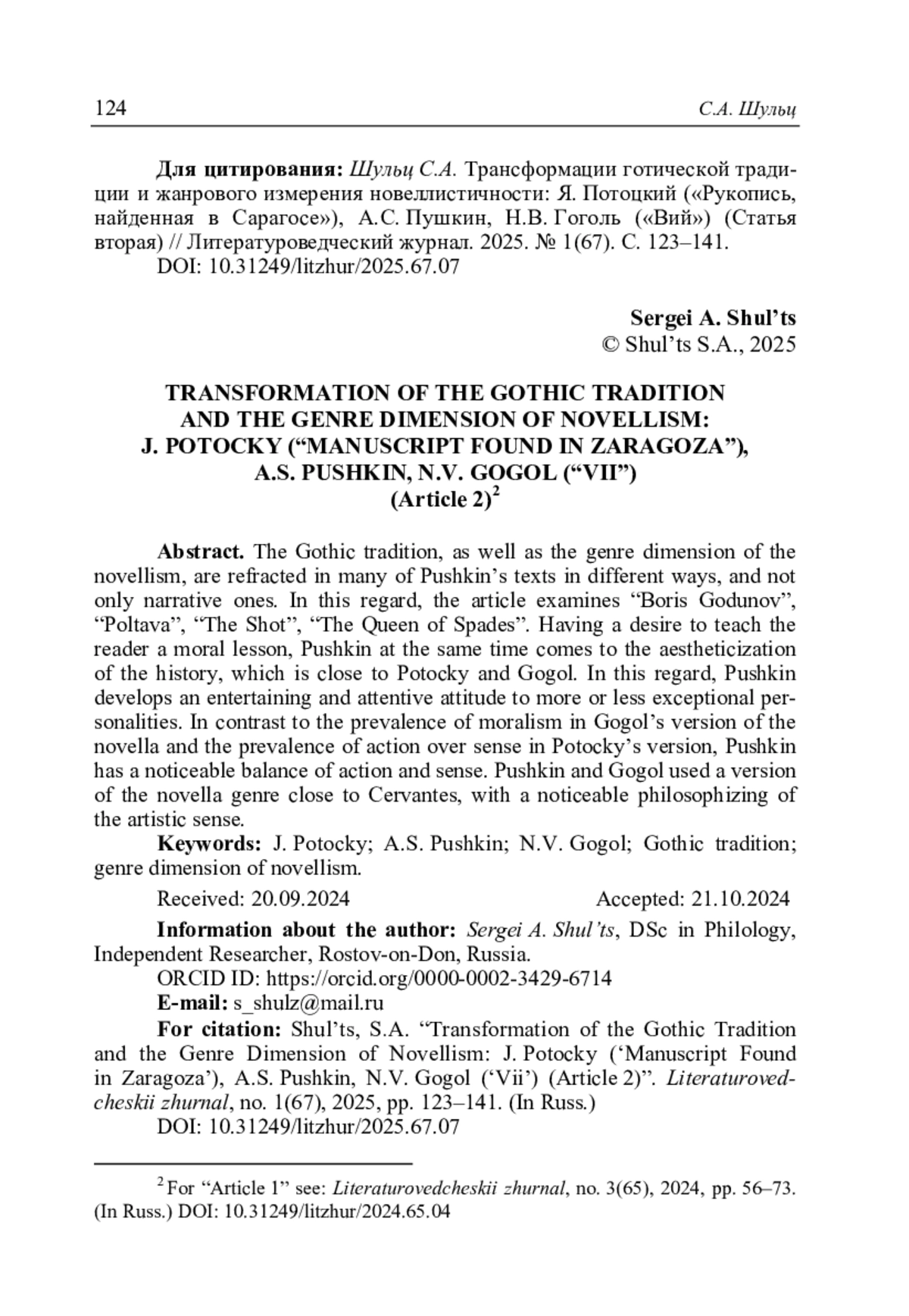 Шульц С.А. Трансформации готической традиции и жанрового измерения новеллистичности: Я. Потоцкий («Рукопись, найденная в Сарагосе»), А.С. Пушкин, Н.В. Гоголь («Вий») (Статья