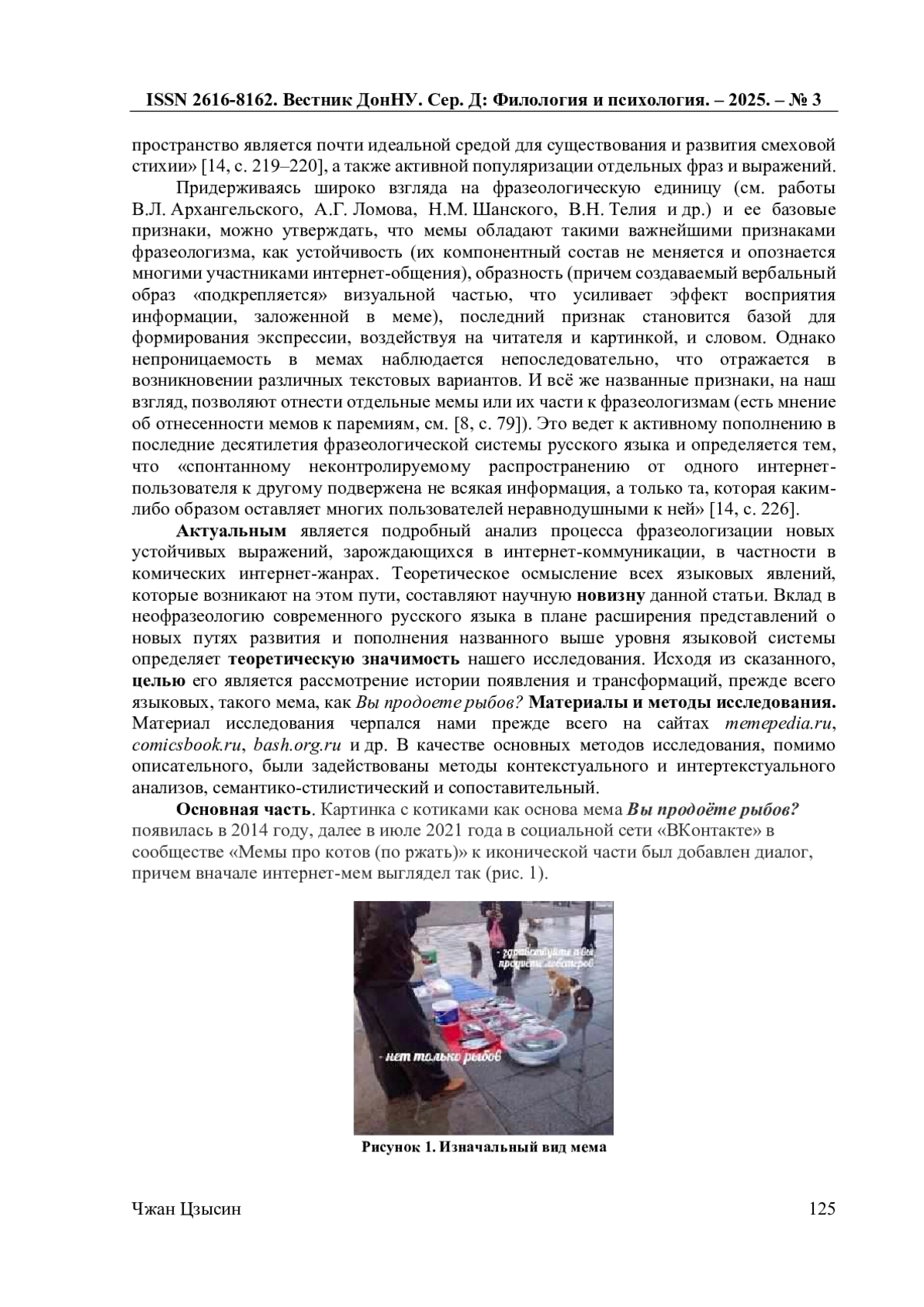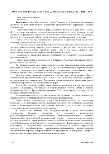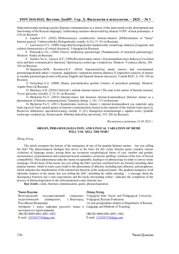 В статье рассматривается история появления одного из популярных интернет-мемов - Вы продоете рыбов? Фразеологизированный диалог, служащий базой для этого комического интернет-жанра, содержит различные нарушения языковых норм: ошибочные морфологические формы падежа, числа и рода; несогласованность грамматической и контекстуальной лексической семантики; ошибочная орфография; нарушение законов лексической сочетаемости. Эти явления делают мем узнаваемым, ведут к его фразеологизации с целью передачи иронических смыслов. На базе мема Вы продоете рыбов? образуются синкретичные креолизованные тексты, включающие другие популярные мемы, что приводит в одних случаях к явлениям аллюзии, включая автоаллюзию, и парафразу, что свидетельствует о проявлении интертекстуальной функции анализируемого мема. Постепенное появление всех идиоматических признаков в меме Вы продоете рыбов?, включая устойчивое значение ‘сообщение о несоответствии собственных ожиданий и суровой окружающей реальности’, свидетельствует о завершении процесса фразеологизации в названном комическом интернет-тексте.