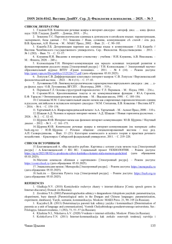 1. Гладкая Н.В. Комические речевые жанры в интернет-дискурсе: автореф. дисс. … канд. филол. наук / Н.В. Гладкая; ДонНУ. - Донецк, 2018. - 29 с.