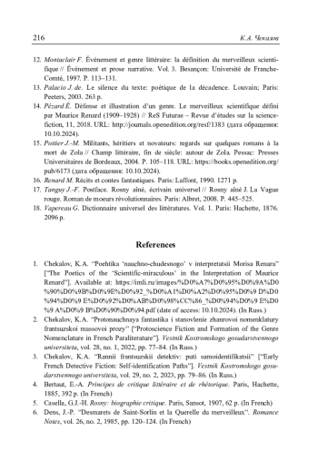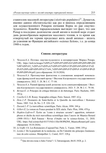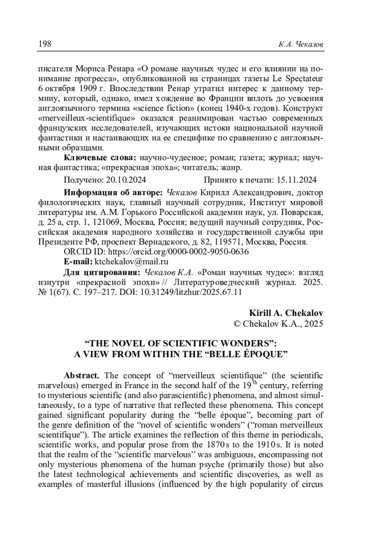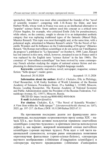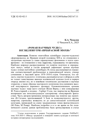 Чекалов К.А. «Роман научных чудес»: взгляд изнутри «прекрасной эпохи» // Литературоведческий журнал. 2025. No 1(67). С. 197–217.