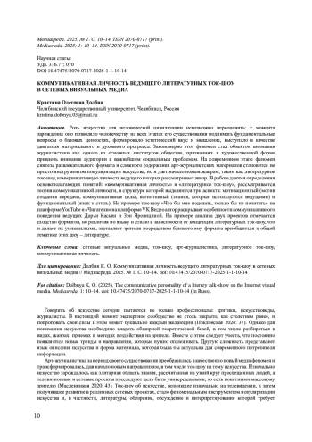 Цель исследования заключается в выявлении и анализе специфических особенностей речевого имиджа ведущих для дальнейшего понимания того, как различные подходы к подаче информации отражают современные тенденции телевизионного и интернет-пространства. Актуальность темы обусловлена не только популярностью ток-шоу на разных медиаплатформах, но и важностью понимания того, как изменение формата влияет на речевой имидж ведущих, на содержание и восприятие таких программ. Сравнительный анализ ток-шоу на телевидении и в социальной сети «ВКонтакте» даст возможность выявить ключевые особенности их реализации, а также изменения, произошедшие с жанром в условиях цифровизации и интерактивности. В статье автор проанализировал сходства и отличительные черты ток- шоу в зависимости от вида платформы, а также выявил специфические особенности речевого имиджа ведущих данных форматов. Материалом стали наиболее просматриваемые выпуски за 2025 год ток-шоу«Мужское/Женское» на «Первом канале» (от 17.04.2025) и ток-шоу «Натальная карта» на видеохостинге«VK Видео» (от 12.03.2025). В процессе анализа был рассмотрен речевой имидж ведущих, определен их коммуникативный стиль, способы взаимодействия с аудиторией, а также установлено, как вербальные средства общения, используемые известными ведущими на телевидении и в Сети, влияют на репутацию программ. Помимо этого, был изучен жанр ток-шоу на телевидении и в сети Интернет для понимания того, как различные медиаплатформы обусловливают специфику контента и коммуникации с аудиторией.