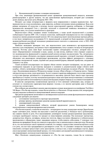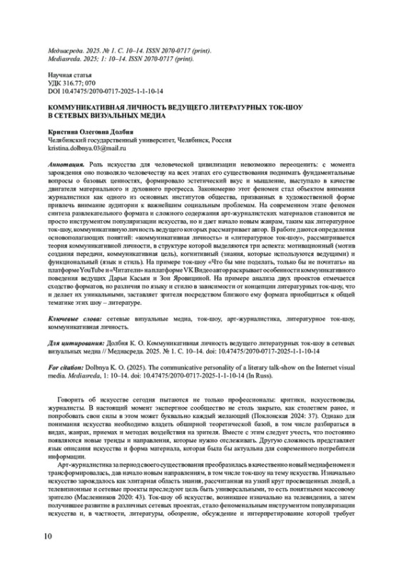 Роль искусства для человеческой цивилизации невозможно переоценить: c момента зарождения оно позволяло человечеству на всех этапах его существования поднимать фундаментальные вопросы о базовых ценностях, формировало эстетический вкус и мышление, выступало в качестве двигателя материального и духовного прогресса. Закономерно этот феномен стал объектом внимания журналистики как одного из основных институтов общества, призванных в художественной форме привлечь внимание аудитории к важнейшим социальным проблемам. На современном этапе феномен синтеза развлекательного формата и сложного содержания арт-журналистских материалов становится не просто инструментом популяризации искусства, но и дает начало новым жанрам, таким как литературное ток-шоу, коммуникативную личность ведущего которых рассматривает автор. В работе даются определения основополагающих понятий: «коммуникативная личность» и «литературное ток-шоу», рассматривается теория коммуникативной личности, в структуре которой выделяются три аспекта: мотивационный (мотив создания передачи, коммуникативная цель), когнитивный (знания, которые используются ведущими) и функциональный (язык и стиль). На примере ток-шоу «Что бы мне поделать, только бы не почитать» на платформе YouTube и «Читатели» на платформе VK Видео автор раскрывает особенности коммуникативного поведения ведущих Дарьи Касьян и Зои Яровициной. На примере анализа двух проектов отмечается сходство форматов, но различия по языку и стилю в зависимости от концепции литературных ток-шоу, что и делает их уникальными, заставляет зрителя посредством близкого ему формата приобщиться к общей тематике этих шоу - литературе.