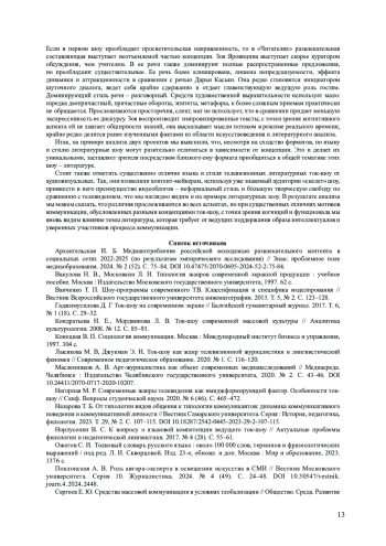 1. Архангельская И. Б. Медиапотребление российской молодежью развлекательного контента в социальных сетях 2022-2025 (по результатам эмпирического исследования) // Знак: проблемное поле медиаобразования. 2024. № 2 (52). С. 75-84. DOI: 10.47475/2070-0695-2024-52-2-75-84 EDN: TJQIVX