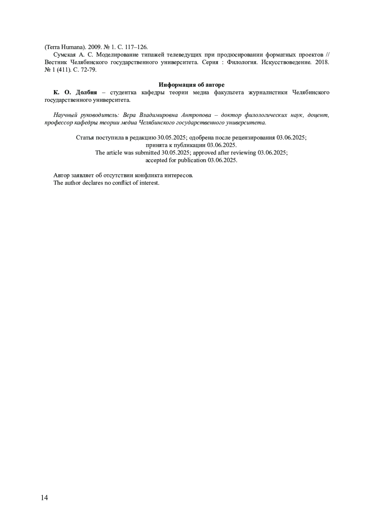 15. Сумская А. С. Моделирование типажей телеведущих при продюсировании форматных проектов // Вестник Челябинского государственного университета. Серия: Филология. Искусствоведение. 2018. № 1 (411). С. 72-79.