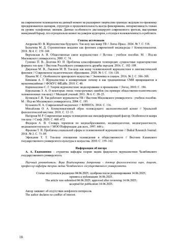 4. Гуленко П. В., Долгова Ю. И. Проблемы классификации телепередач: сущностные характеристики формата ток-шоу // Вестник Российского университета дружбы народов. 2016. С. 102-109.