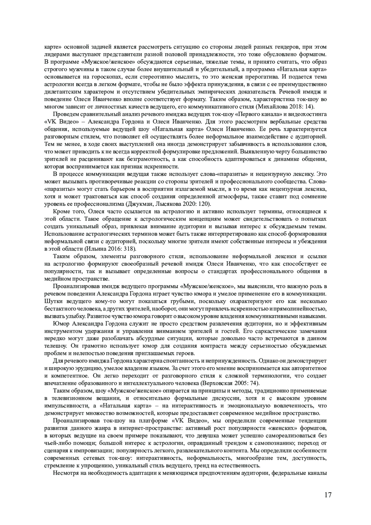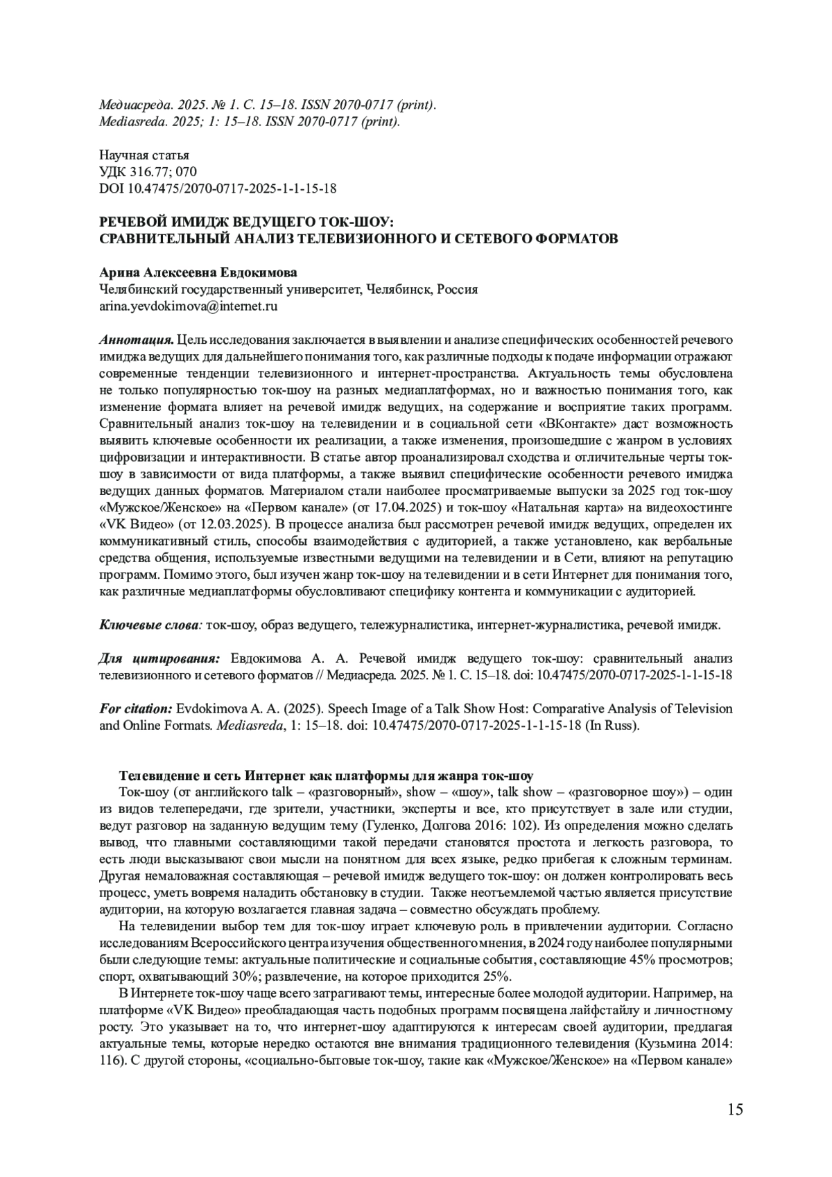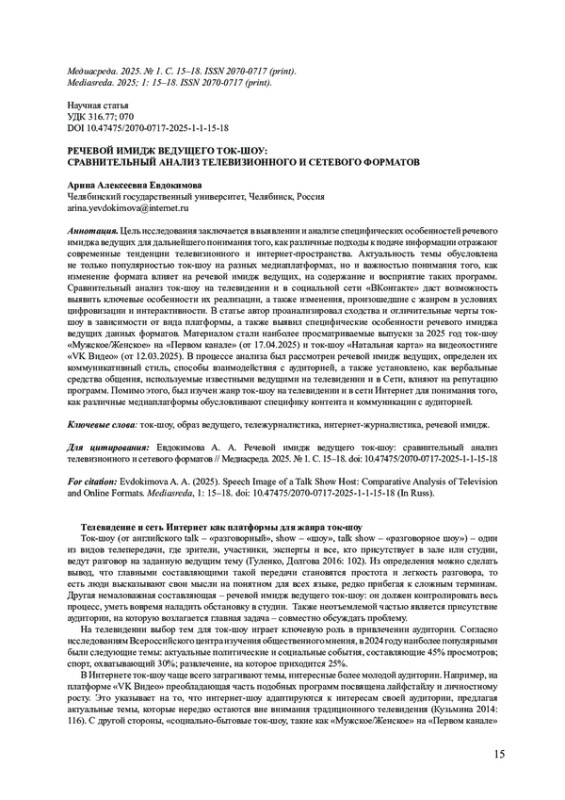 Цель исследования заключается в выявлении и анализе специфических особенностей речевого имиджа ведущих для дальнейшего понимания того, как различные подходы к подаче информации отражают современные тенденции телевизионного и интернет-пространства. Актуальность темы обусловлена не только популярностью ток-шоу на разных медиаплатформах, но и важностью понимания того, как изменение формата влияет на речевой имидж ведущих, на содержание и восприятие таких программ. Сравнительный анализ ток-шоу на телевидении и в социальной сети «ВКонтакте» даст возможность выявить ключевые особенности их реализации, а также изменения, произошедшие с жанром в условиях цифровизации и интерактивности. В статье автор проанализировал сходства и отличительные черты ток- шоу в зависимости от вида платформы, а также выявил специфические особенности речевого имиджа ведущих данных форматов. Материалом стали наиболее просматриваемые выпуски за 2025 год ток-шоу«Мужское/Женское» на «Первом канале» (от 17.04.2025) и ток-шоу «Натальная карта» на видеохостинге«VK Видео» (от 12.03.2025). В процессе анализа был рассмотрен речевой имидж ведущих, определен их коммуникативный стиль, способы взаимодействия с аудиторией, а также установлено, как вербальные средства общения, используемые известными ведущими на телевидении и в Сети, влияют на репутацию программ. Помимо этого, был изучен жанр ток-шоу на телевидении и в сети Интернет для понимания того, как различные медиаплатформы обусловливают специфику контента и коммуникации с аудиторией.