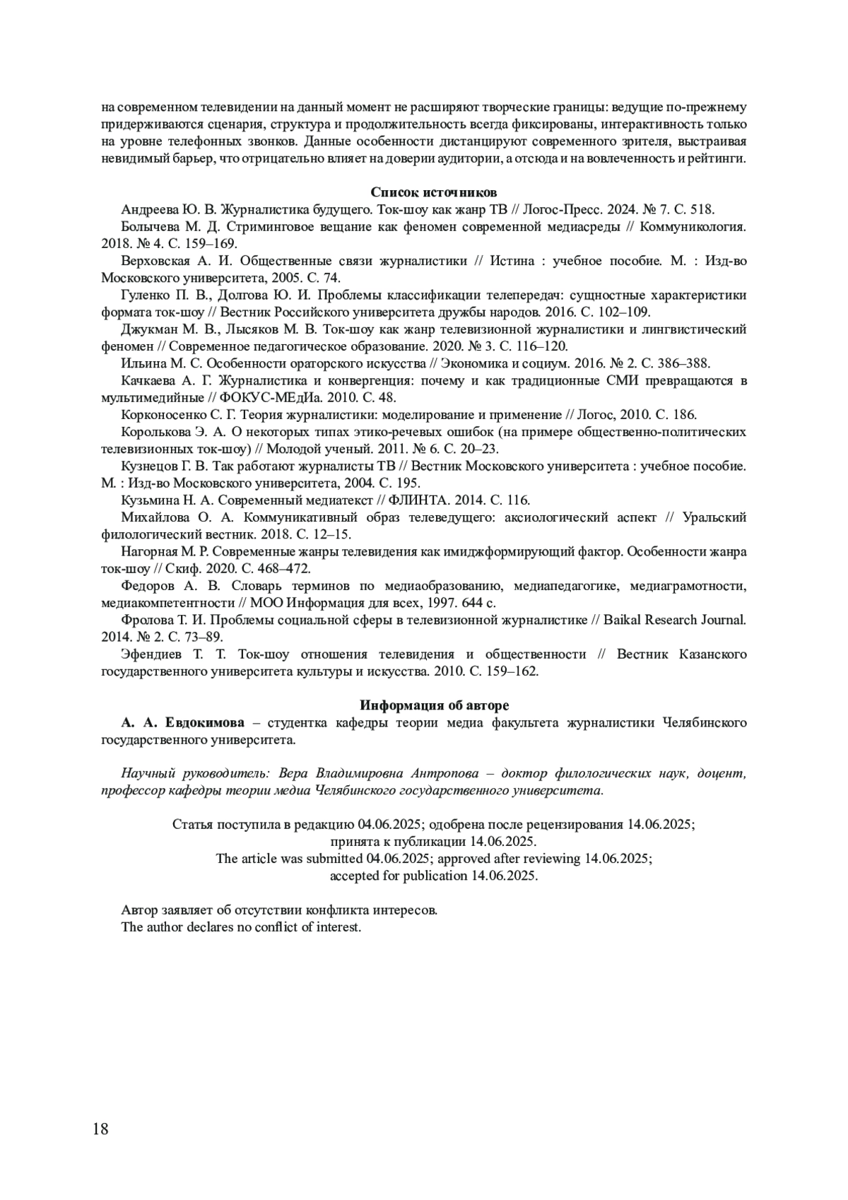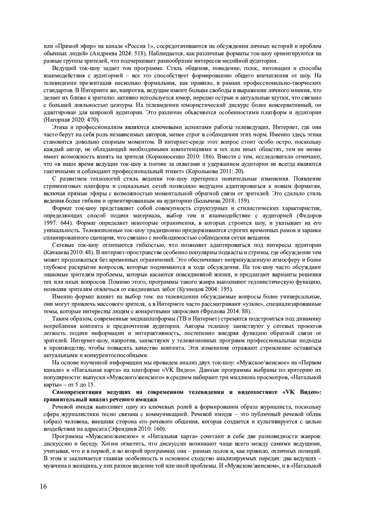 1. Андреева Ю. В. Журналистика будущего. Ток-шоу как жанр ТВ // Логос-Пресс. 2024. № 7. С. 518.