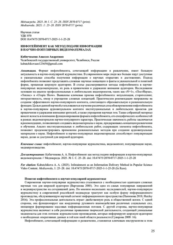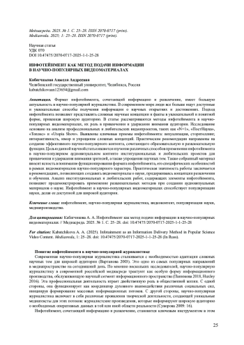 Формат инфотейнмента, сочетающий информацию и развлечение, имеет большую актуальность в научно-популярной журналистике. В современном мире люди все больше ищут доступные и увлекательные способы получения информации о научных открытиях и достижениях. Подход инфотеймента позволяет представлять сложные научные концепции и факты в увлекательной и понятной форме, привлекая широкую аудиторию. В статье рассматриваются методы инфотейнмента в научно- популярных видеоматериалах, их роль в привлечении и удержании внимания аудитории. Исследование основано на анализе профессиональных и любительских видеопроектов, таких как «N+1», «ПостНаука»,«Топлес» и «Utopia Show». Выявлены ключевые приемы инфотейнмента: визуализация, сторителлинг, интерактивность, юмор и упрощение сложных концепций. Практические рекомендации направлены на создание эффективного научно-популярного контента, сочетающего образовательную и развлекательную функции. Целью данной научной статьи является изучение различных способов применения инфотейнмента в научно-популярном аудиовизуальном контенте институциональных и любительских проектов для привлечения и удержания внимания зрителей, а также упрощения научных тем. Также собранный материал вносит ясность в понимание функционирования формата инфотейнмента, его специфических особенностей в рамках видеоматериалов научно-популярного характера. Практическая значимость работы заключается в рекомендациях, позволяющих создавать видеоматериалы о науке, придерживаясь концепции развлечения и обучения. Анализ институциональных и любительских работ, содержащих элементы инфотейнмента, позволяет продемонстрировать применение развлекательных методов при создании аудиовизуальных материалов о науке. Инфотейнмент в научно-популярных видеоматериалах способствует популяризации науки, делая ее доступной для широкой аудитории.