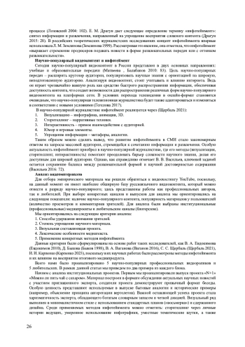 Сегодня научно-популярный видеоконтент в России представлен в двух основных направлениях: учебные и образовательные передачи (Матвеева, Балабанов 2010: 83). Цель научно-популярных передач – расширить кругозор аудитории, популяризовать научные знания с ориентацией на широкую, неподготовленную аудиторию. Анализируя видеоконтент, стоит учитывать и влияние интернета. Ведь он играет чрезвычайно важную роль как средство быстрого распространения информации, обеспечивая доступность контента, что создает возможности для распространения различных форм научно-популярного видеоконтента на платформах сети. В условиях перехода телевидения в онлайн-формат становится очевидным, что научно-популярная телевизионная журналистика будет также адаптироваться и изменяться в соответствии с новыми условиями (Гегелова 2017).