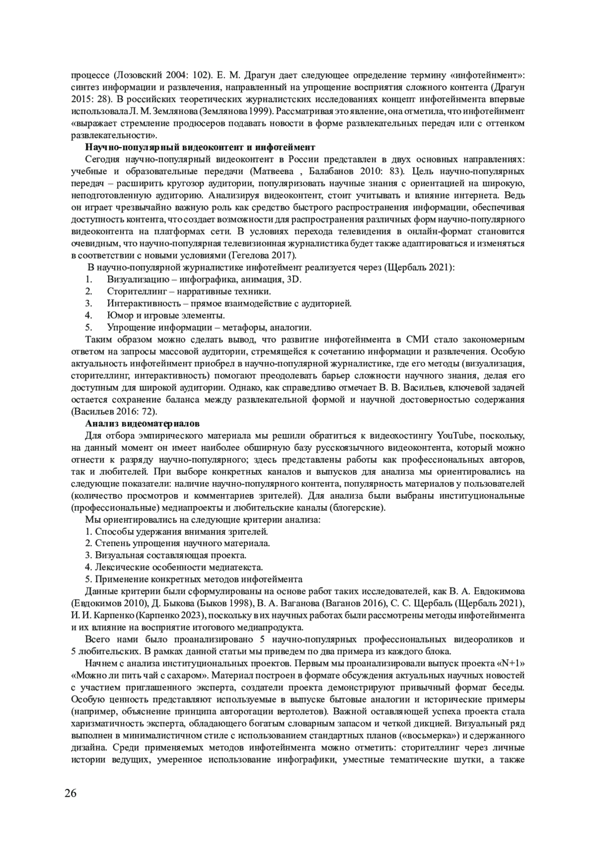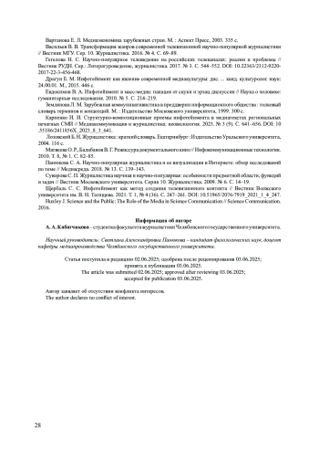 4. Васильев В. В. Трансформация жанров современной телевизионной научно-популярной журналистики // Вестник МГУ. Сер. 10. Журналистика. 2016. № 4. С. 69-89.