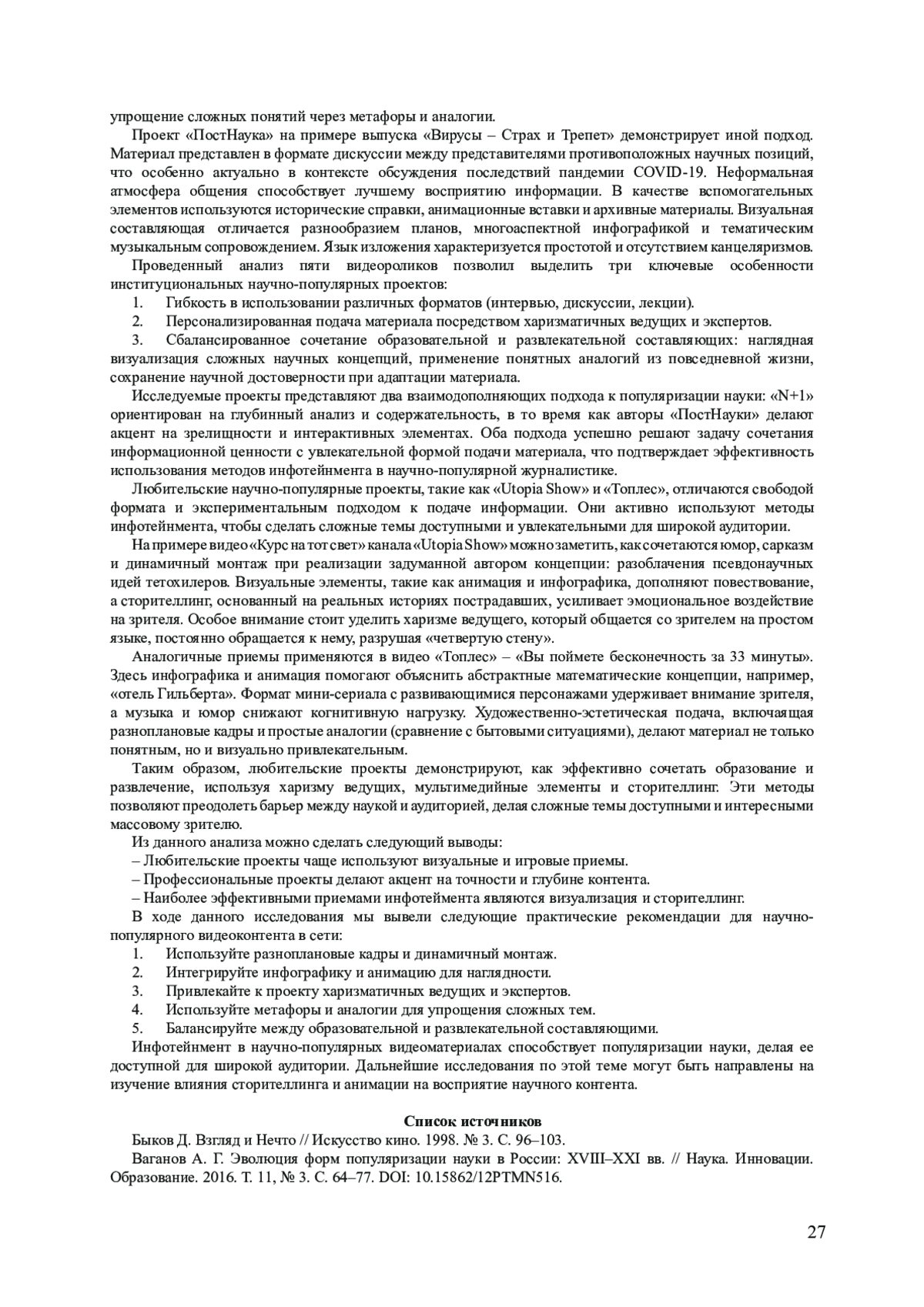 2. Ваганов А. Г. Эволюция форм популяризации науки в России: XVIII-XXI вв. // Наука. Инновации. Образование. 2016. Т. 11, № 3. С. 64-77. DOI: 10.15862/12PTMN516 EDN: WYJTMD