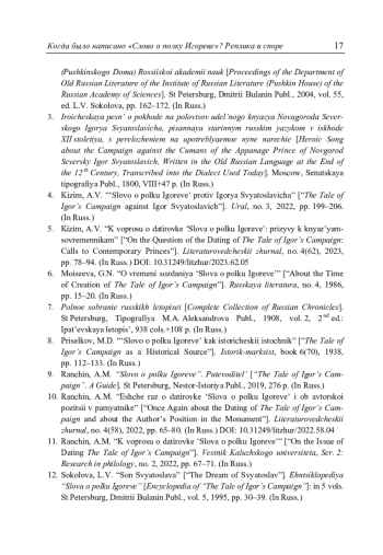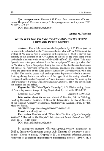 Ранчин А.М. Когда было написано «Слово о полку Игореве»? Реплика в споре // Литературоведческий журнал. 2025. No 3(69). С. 9–17.