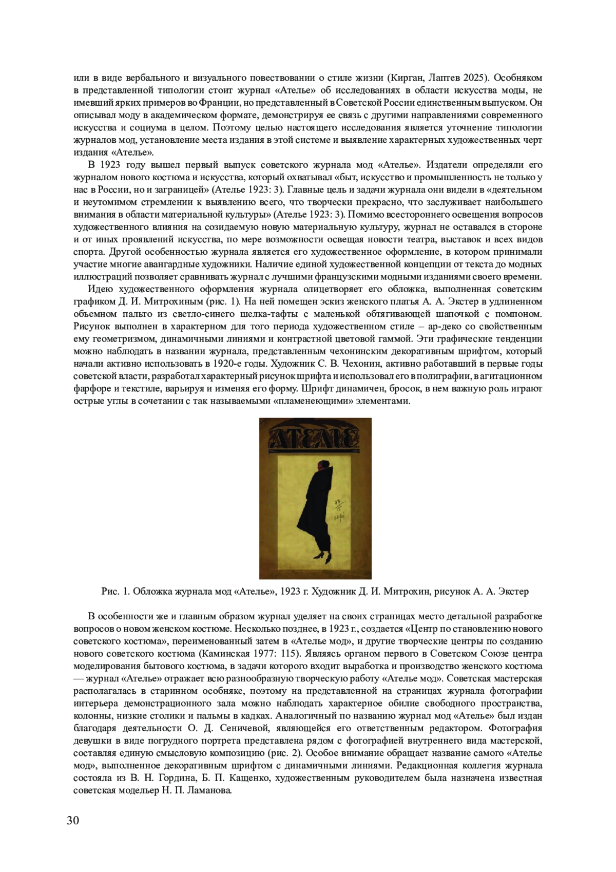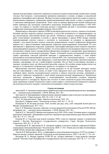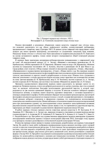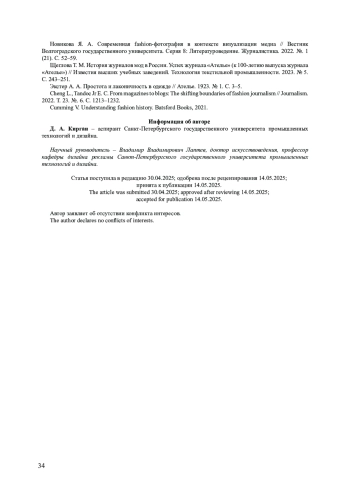 7. Кирган Д. А., Лаптев В. В. Французские журналы мод (1920-1930-е годы). Основные виды и тенденции визуальных концепций // Декоративное искусство и предметно-пространственная среда. Вестник МГХПУ. 2025. № 1. Ч. 2. С. 170-182. EDN: MXUKVZ
