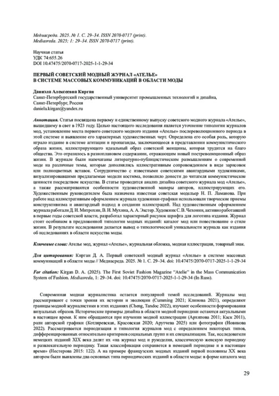 Статья посвящена первому и единственному выпуску советского модного журнала «Ателье», вышедшему в свет в 1923 году. Целью настоящего исследования является уточнение типологии журналов мод, установление места первого советского модного издания «Ателье» послереволюционного периода в этой системе и выявление его характерных художественных черт. Определена его особая роль, которую играло издание в системе агитации и пропаганды, заключающееся в представлении коммунистического образа жизни, иллюстрирующего идеальный образ советской женщины, которая трудится на благо общества. Это отразилось в разноплановом содержании, отражающим новый постреволюционный образ жизни. В журнале были напечатаны литературно-публицистическим размышлениям о современной моде на различные темы, которые дополнялись иллюстративным сопровождением в виде зарисовок или полноцветных вставок. Сотрудничество с известными советскими авангардными художниками, визуализировавшими предлагаемые модели костюма, позволило донести до читателя коммунистические ценности посредством искусства. В статье проводится анализ дизайна советского журнала мод «Ателье», а также рассматриваются особенности художественной манеры авторов, иллюстрирующих его. Художественным руководителем была назначена известная советская модельер Н. П. Ламанова. При работе над иллюстративным оформлением журнала художники-графики использовали творческие приемы конструктивизма и авангардный подход в создании иллюстраций. Над художественным оформлением журнала работали Д. И. Митрохин, В. И. Мухина, А. А. Экстер. Художник С. В. Чехонин, активно работавший в первые годы советской власти, разработал характерный рисунок шрифта для логотипа издания. Журнал стоит особняком в предложенной типологии модных изданий: каталог мод или повествование о стиле жизни. В результате исследования делается вывод о типологической уникальности журнала как издания об исследованиях в области искусства моды.