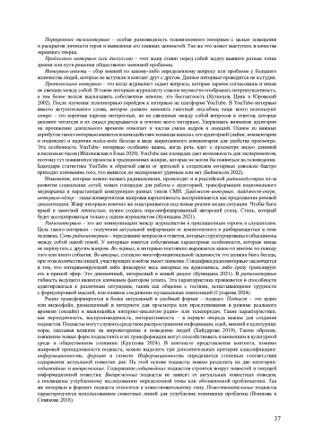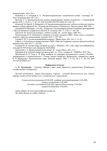 1. Бейненсон В. А. Трансформация жанра интервью в YouTube: типология экспериментальных форматов // Вопросы журналистики. 2022. № 11. С. 54-70. DOI: 10.17223/26188422/11/3 EDN: CCYKVC