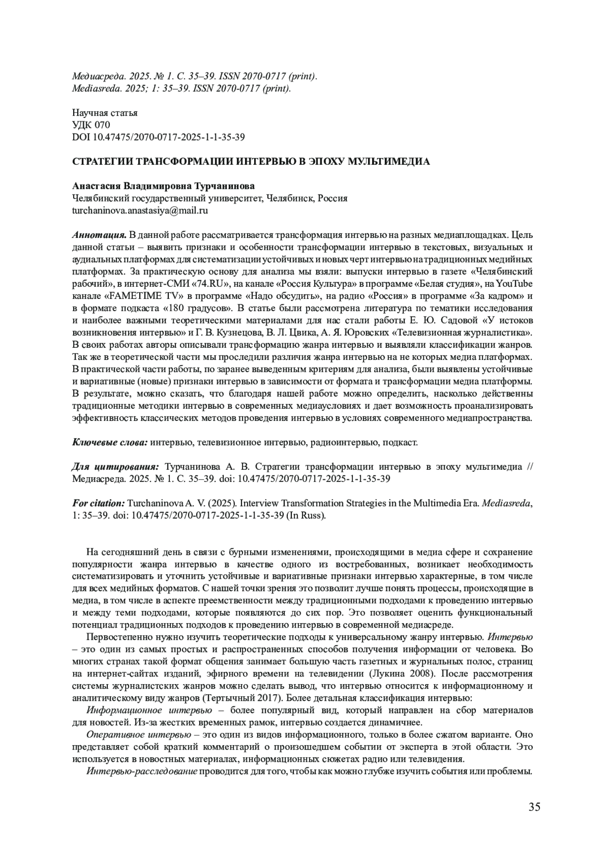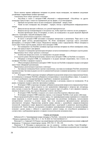 В данной работе рассматривается трансформация интервью на разных медиаплощадках. Цель данной статьи - выявить признаки и особенности трансформации интервью в текстовых, визуальных и аудиальных платформах для систематизации устойчивых и новых черт интервью на традиционных медийных платформах. За практическую основу для анализа мы взяли: выпуски интервью в газете «Челябинский рабочий», в интернет-СМИ «74. RU», на канале «Россия Культура» в программе «Белая студия», на YouTube канале «FAMETIME TV» в программе «Надо обсудить», на радио «Россия» в программе «За кадром» и в формате подкаста «180 градусов». В статье были рассмотрена литература по тематики исследования и наиболее важными теоретическими материалами для нас стали работы Е. Ю. Садовой «У истоков возникновения интервью» и Г. В. Кузнецова, В. Л. Цвика, А. Я. Юровских «Телевизионная журналистика». В своих работах авторы описывали трансформацию жанра интервью и выявляли классификации жанров. Так же в теоретической части мы проследили различия жанра интервью на не которых медиа платформах. В практической части работы, по заранее выведенным критериям для анализа, были выявлены устойчивые и вариативные (новые) признаки интервью в зависимости от формата и трансформации медиа платформы. В результате, можно сказать, что благодаря нашей работе можно определить, насколько действенны традиционные методики интервью в современных медиаусловиях и дает возможность проанализировать эффективность классических методов проведения интервью в условиях современного медиапространства.
