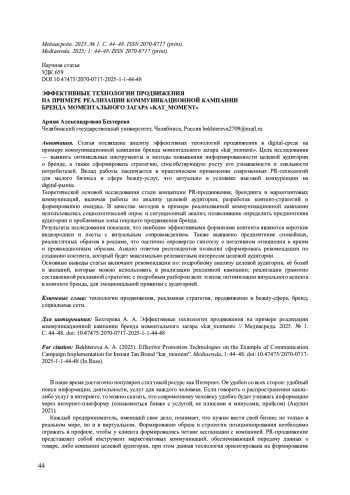 Статья посвящена анализу эффективных технологий продвижения в digital-среде на примере коммуникационной кампании бренда моментального загара «kat_moment». Цель исследования-выявить оптимальные инструменты и методы повышения информированности целевой аудитории о бренде, а также сформировать стратегию, способствующую росту его узнаваемости и лояльности потребителей. Вклад работы заключается в практическом применении современных PR-технологий для малого бизнеса в сфере beauty-услуг, что актуально в условиях высокой конкуренции на digital-рынке. Теоретической основой исследования стали концепции PR-продвижения, брендинга и маркетинговых коммуникаций, включая работы по анализу целевой аудитории, разработке контент-стратегий и формированию имиджа. В качестве методов в примере реализованной коммуникационной кампании использовались социологический опрос и ситуационный анализ, позволившие определить предпочтения аудитории и проблемные зоны текущего продвижения бренда. Результаты исследования показали, что наиболее эффективными форматами контента являются короткие видеоролики и посты с визуальным сопровождением. Также выявлено предпочтение спокойных, реалистичных образов в рекламе, что частично опровергло гипотезу о негативном отношении к ярким и провокационным образам. Анализ ответов респондентов позволил сформировать рекомендации по созданию контента, который будет максимально релевантным интересам целевой аудитории. Основные выводы статьи включают рекомендации по: подробному анализу целевой аудитории, её болей и желаний, которые можно использовать в реализации рекламной кампании; реализации грамотно составленной рекламной стратегии, с подробным разбором всех этапов; оптимизации визуального аспекта в контенте бренда, для эмоциональной привязки с аудиторией.