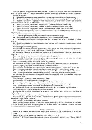 4. Волкова Д. С. Контент-план как основной инструмент формирования коммуникации в социальных сетях // Современные научные исследования и инновации. 2021. № 12. URL: https://web.snauka.ru/issues/2021/12/97273 (дата обращения: 19.03.2025). EDN: PENFKT