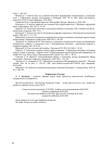 15. Убушаева С. М. Особенности проведения рекламных кампаний в Интернете // Синергия Наук. 2019. № 36. С. 286-291. EDN: ZZDPPN