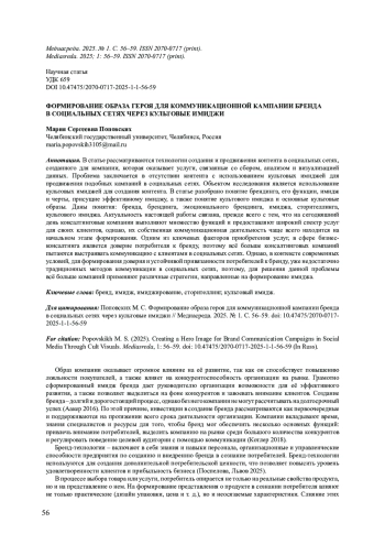 В статье рассматриваются технологии создания и продвижения контента в социальных сетях, созданного для компании, которая оказывает услуги, связанные со сбором, анализом и визуализацией данных. Проблема заключается в отсутствии контента с использованием культовых имиджей для продвижения подобных кампаний в социальных сетях. Объектом исследования является использование культовых имиджей для создания контента. В статье разобрано понятие брендинга, его функции, имидж и черты, присущие эффективному имиджу, а также понятие культового имиджа и основные культовые образы. Даны понятия: бренда, брендинга, эмоционального брендинга, имиджа, сторителлинга, культового имиджа. Актуальность настоящей работы связана, прежде всего с тем, что на сегодняшний день консалтинговые компании выполняют множество функций и предоставляют широкий спектр услуг для своих клиентов, однако, их собственная коммуникационная деятельность чаще всего находится на начальном этапе формирования. Одним из ключевых факторов приобретения услуг, в сфере бизнес-консалтинга является доверие потребителя к бренду, поэтому всё больше консалтинговых компаний пытаются выстраивать коммуникацию с клиентами в социальных сетях. Однако, в контексте современных условий, для формирования доверия и устойчивой привязанности потребителей к бренду, уже недостаточно традиционных методов коммуникации в социальных сетях, поэтому, для решения данной проблемы всё больше компаний применяют различные стратегии, направленные на формирование имиджа.