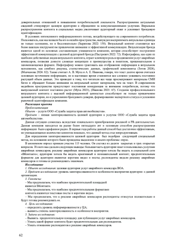 В условиях современной цифровой реальности, где мобильные устройства и социальные медиа превратились в неотъемлемый элемент повседневного существования, пренебрежение SMM-продвижением в сфере услуг представляет собой стратегически неверное решение. И. Э. Цыренова и С. Э. Желаева подтверждают этот факт, утверждая, что разработка программы введения SMM помогает организации оптимизировать рекламную и PR-деятельность и завоевать основные целевые аудитории (Цыренова 2022), (Желаева 2022: 72). Для аварийных комиссаров, равно как и для большинства профессиональных субъектов, активное присутствие в социальных медиа представляет собой не временную тенденцию, а объективную необходимость. Социальные сети, на данный период времени, приравнялись по эффективности к рекламе по телевидению. Происходит это по той причине, что аудитория социальных сетей более внимательна и активна, вызвано это тем, что контакт с потенциальным клиентом устанавливается точечно, учитываются потребности каждого (Гаврикова 2020: 37).
