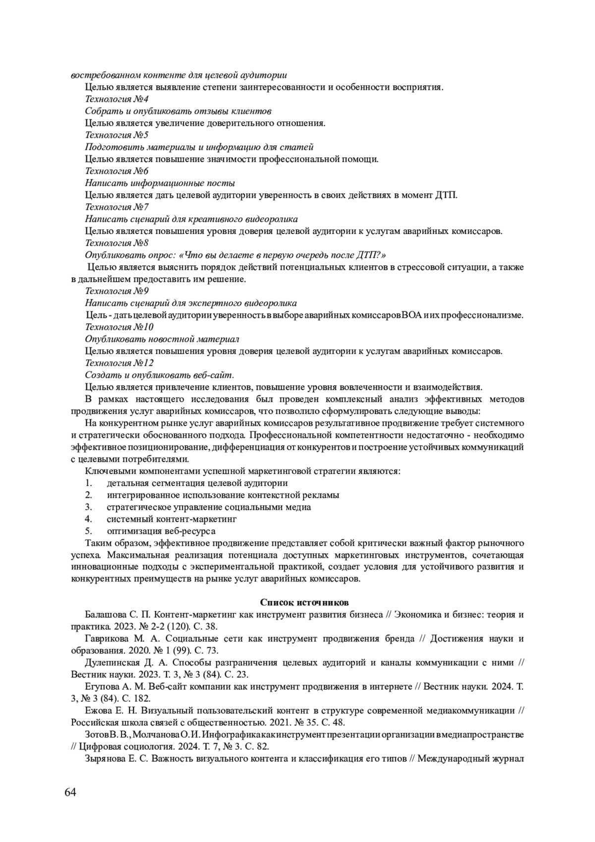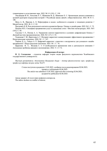 12. Сысоева Т. Л., Попова А. А. Управление контент-маркетингом в условиях цифровизации бизнеса // Деловой вестник предпринимателя. 2024. № 3 (17). С. 93. EDN: GLHYXY