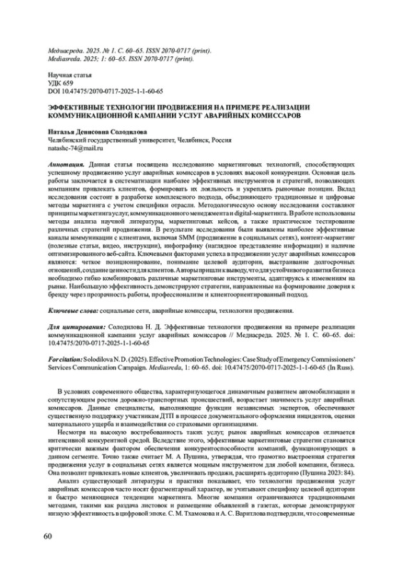 Данная статья посвящена исследованию маркетинговых технологий, способствующих успешному продвижению услуг аварийных комиссаров в условиях высокой конкуренции. Основная цель работы заключается в систематизации наиболее эффективных инструментов и стратегий, позволяющих компаниям привлекать клиентов, формировать их лояльность и укреплять рыночные позиции. Вклад исследования состоит в разработке комплексного подхода, объединяющего традиционные и цифровые методы маркетинга с учетом специфики отрасли. Методологическую основу исследования составляют принципы маркетинга услуг, коммуникационного менеджмента и digital-маркетинга. В работе использованы методы анализа научной литературы, маркетинговых кейсов, а также практическое тестирование различных стратегий продвижения. В результате исследования были выявлены наиболее эффективные каналы коммуникации с клиентами, включая SMM (продвижение в социальных сетях), контент-маркетинг (полезные статьи, видео, инструкции), инфографику (наглядное представление информации) и наличие оптимизированного веб-сайта. Ключевыми факторами успеха в продвижении услуг аварийных комиссаров являются: четкое позиционирование, понимание целевой аудитории, выстраивание долгосрочных отношений, создание ценности для клиентов. Авторы пришли к выводу, что для устойчивого развития бизнеса необходимо гибко комбинировать различные маркетинговые инструменты, адаптируясь к изменениям на рынке. Наибольшую эффективность демонстрируют стратегии, направленные на формирование доверия к бренду через прозрачность работы, профессионализм и клиентоориентированный подход.