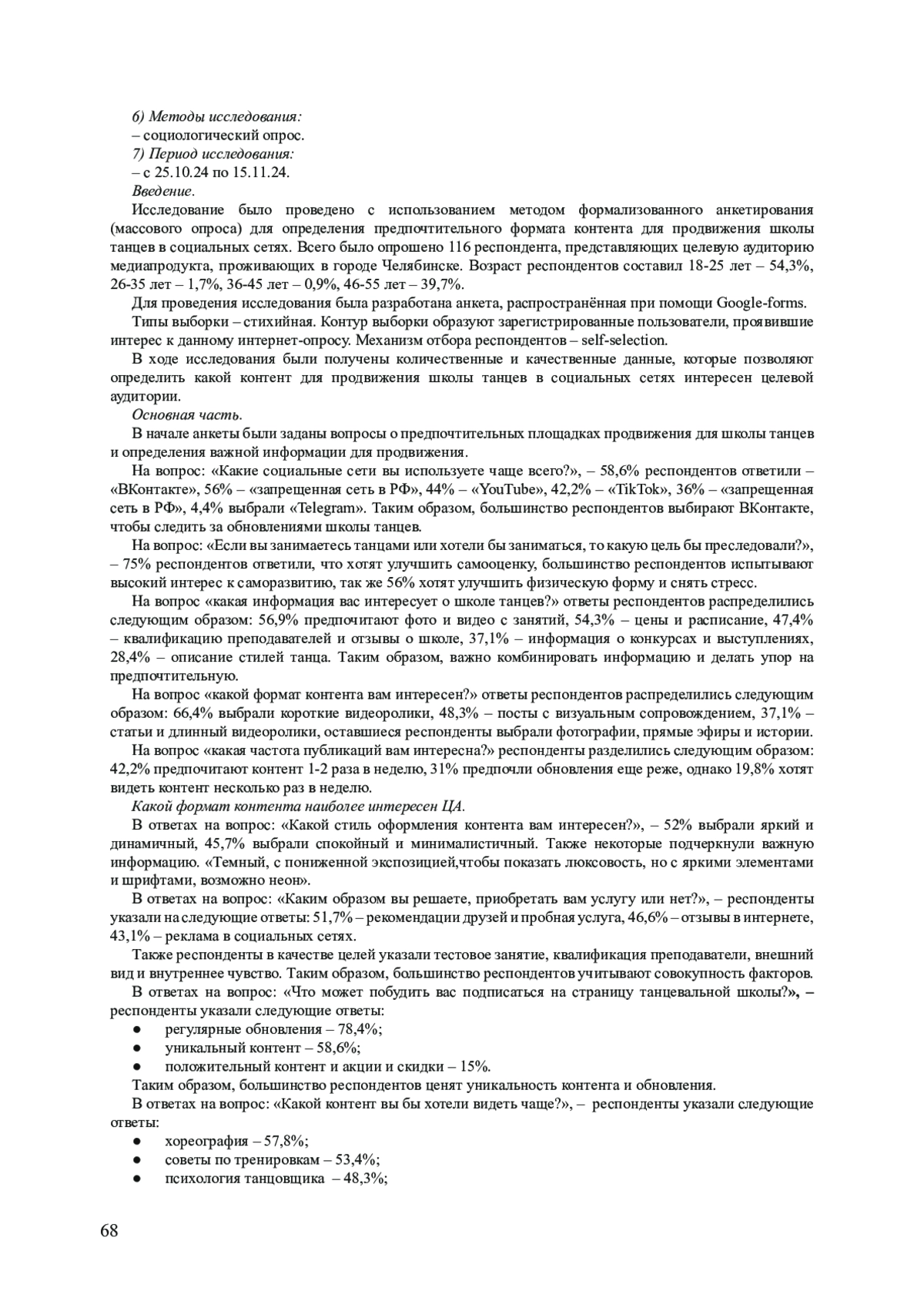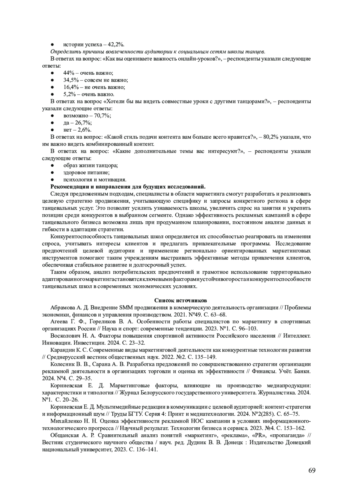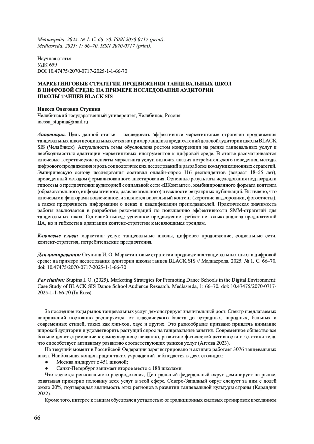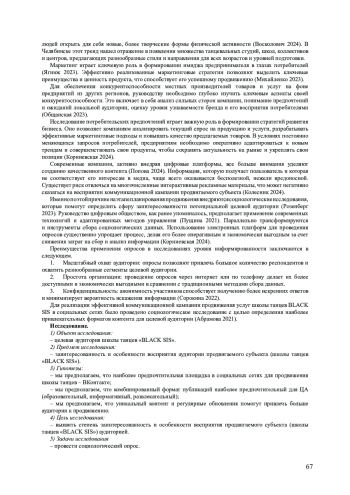 Цель данной статьи - исследовать эффективные маркетинговые стратегии продвижения танцевальных школ в социальных сетях на примере анализа предпочтений целевой аудитории школы BLACK SIS (Челябинск). Актуальность темы обусловлена ростом конкуренции на рынке танцевальных услуг и необходимостью адаптации маркетинговых инструментов к цифровой среде. В статье рассматриваются ключевые теоретические аспекты маркетинга услуг, включая анализ потребительского поведения, методы цифрового продвижения и роль социологических исследований в разработке коммуникационных стратегий. Эмпирическую основу исследования составил онлайн-опрос 116 респондентов (возраст 18-55 лет), проведенный методом формализованного анкетирования. Основные результаты исследования подтвердили гипотезы о предпочтении аудиторией социальной сети «ВКонтакте», комбинированного формата контента (образовательного, информативного, развлекательного) и важности регулярных публикаций. Выявлено, что ключевыми факторами вовлеченности являются визуальный контент (короткие видеоролики, фотоотчеты), а также прозрачность информации о ценах и квалификации преподавателей. Практическая значимость работы заключается в разработке рекомендаций по повышению эффективности SMM-стратегий для танцевальных школ. Основной вывод: успешное продвижение требует не только анализа предпочтений ЦА, но и гибкости в адаптации контент-стратегии к меняющимся трендам.