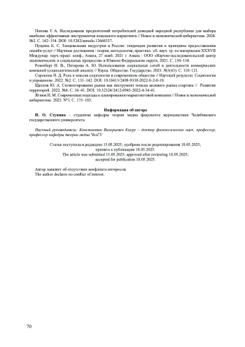 15. Ягнюк И. М. Современные подходы к планированию маркетинговой компании // Новое в экономической кибернетике. 2023. Nº1. С. 175-185. EDN: EOGOKZ