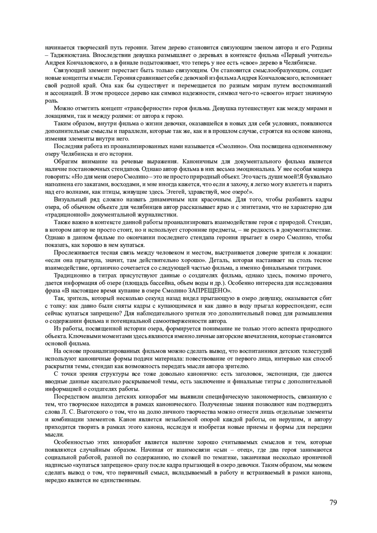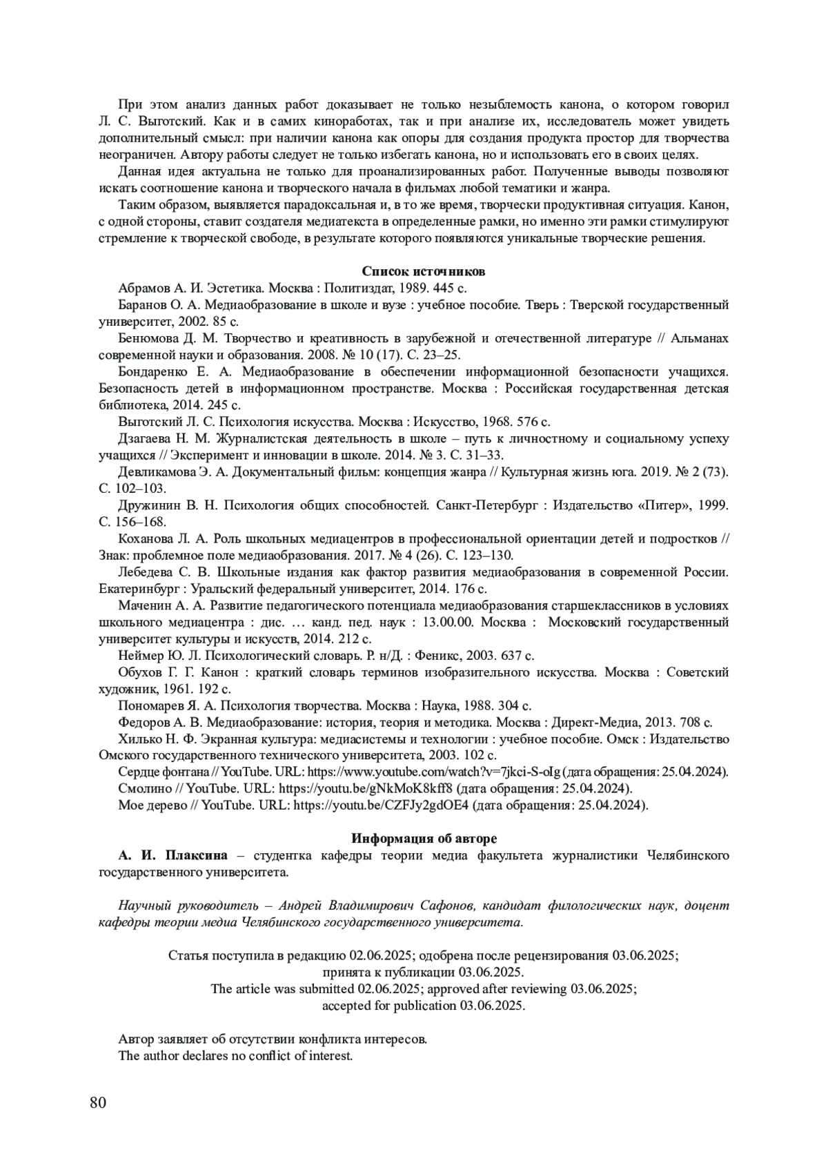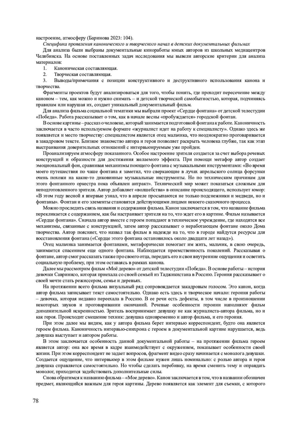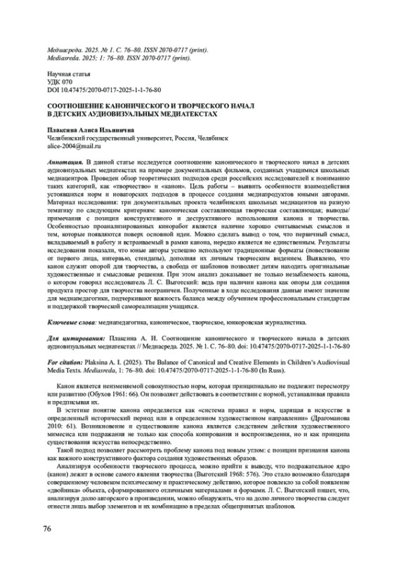 В данной статье исследуется соотношение канонического и творческого начал в детских аудиовизуальных медиатекстах на примере документальных фильмов, созданных учащимися школьных медиацентров. Проведен обзор теоретических подходов среди российских исследователей к пониманию таких категорий, как «творчество» и «канон». Цель работы - выявить особенности взаимодействия устоявшихся норм и новаторских подходов в процессе создания медиапродуктов юными авторами. Материал исследования: три документальных проекта челябинских школьных медиацентов на разную тематику по следующим критериям: каноническая составляющая творческая составляющая; выводы/ примечания с позиции конструктивного и деструктивного использования канона и творчества. Особенностью проанализированных киноработ является наличие хорошо считываемых смыслов и тем, которые появляются поверх основной идеи. Можно сделать вывод о том, что первичный смысл, вкладываемый в работу и встраиваемый в рамки канона, нередко является не единственным. Результаты исследования показали, что юные авторы успешно используют традиционные форматы (повествование от первого лица, интервью, стендапы), дополняя их личным творческим видением. Выявлено, что канон служит опорой для творчества, а свобода от шаблонов позволяет детям находить оригинальные художественные и смысловые решения. При этом анализ доказывает не только незыблемость канона, о котором говорил исследователь Л. С. Выготский: ведь при наличии канона как опоры для создания продукта простор для творчества неограничен. Полученные в ходе исследования данные имеют значение для медиапедагогики, подчеркивают важность баланса между обучением профессиональным стандартам и поддержкой творческой самореализации учащихся.