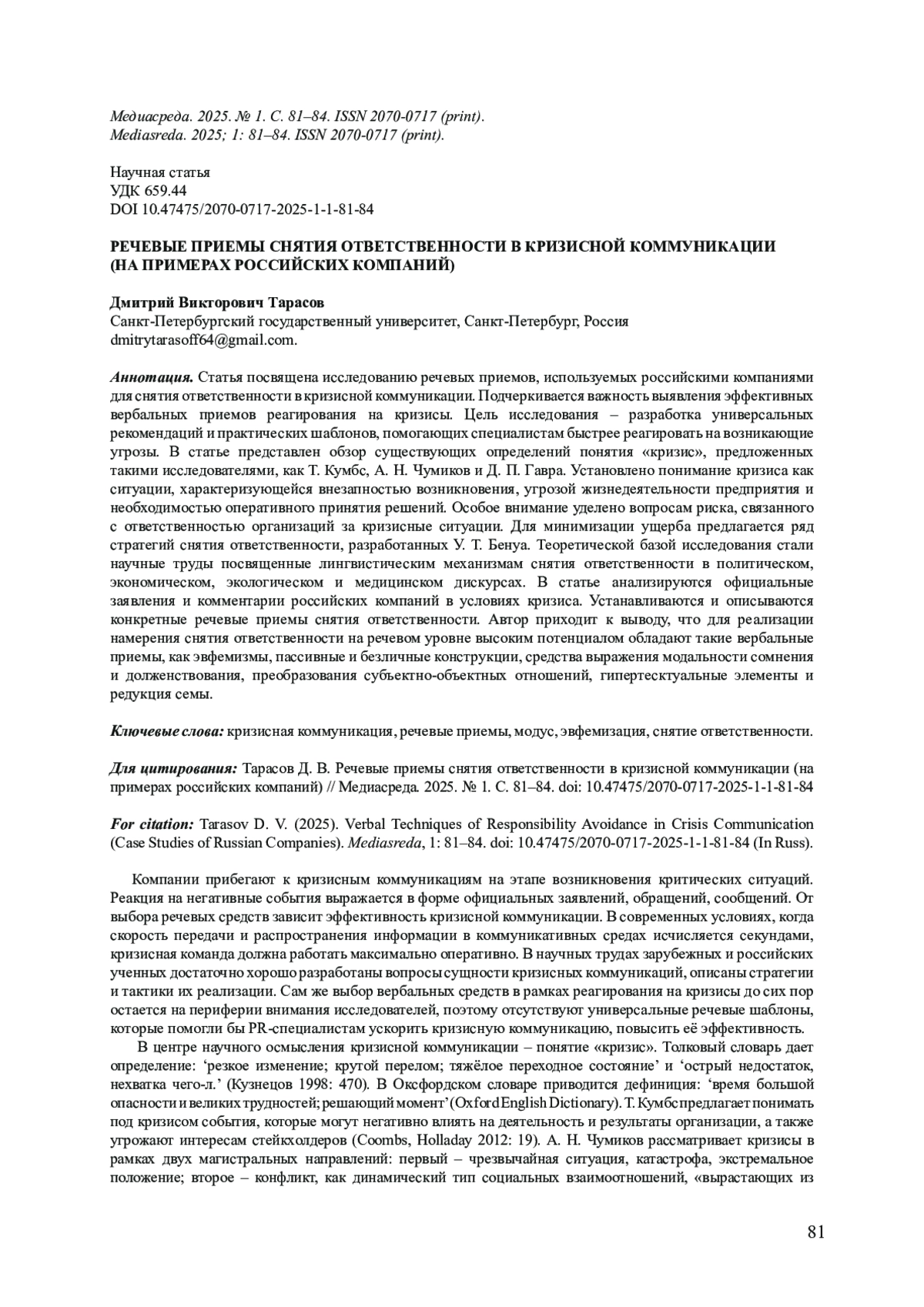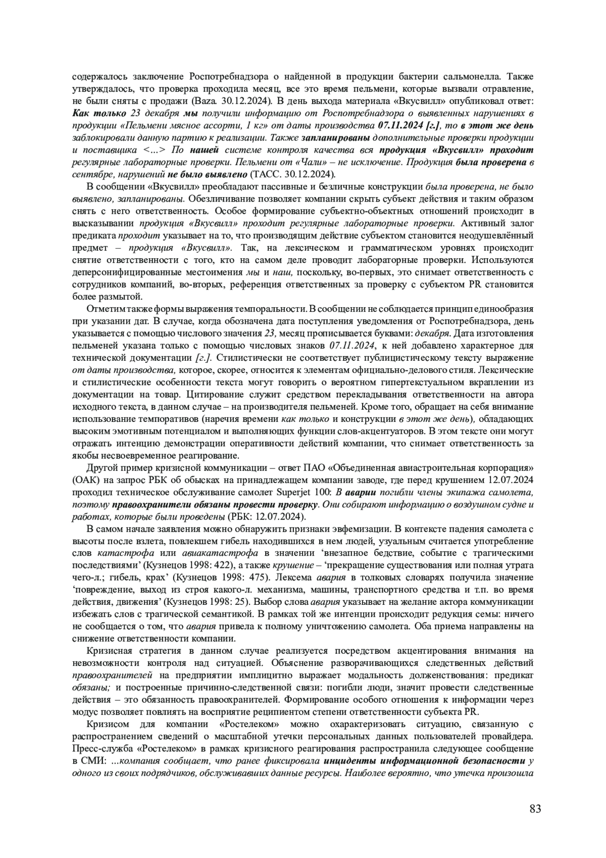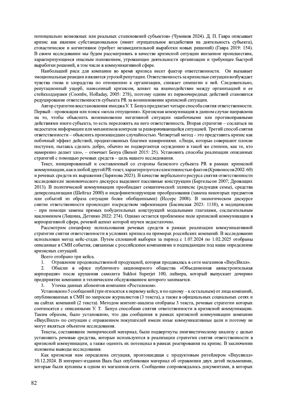 Статья посвящена исследованию речевых приемов, используемых российскими компаниями для снятия ответственности в кризисной коммуникации. Подчеркивается важность выявления эффективных вербальных приемов реагирования на кризисы. Цель исследования - разработка универсальных рекомендаций и практических шаблонов, помогающих специалистам быстрее реагировать на возникающие угрозы. В статье представлен обзор существующих определений понятия «кризис», предложенных такими исследователями, как Т. Кумбс, А. Н. Чумиков и Д. П. Гавра. Установлено понимание кризиса как ситуации, характеризующейся внезапностью возникновения, угрозой жизнедеятельности предприятия и необходимостью оперативного принятия решений. Особое внимание уделено вопросам риска, связанного с ответственностью организаций за кризисные ситуации. Для минимизации ущерба предлагается ряд стратегий снятия ответственности, разработанных У. Т. Бенуа. Теоретической базой исследования стали научные труды посвященные лингвистическим механизмам снятия ответственности в политическом, экономическом, экологическом и медицинском дискурсах. В статье анализируются официальные заявления и комментарии российских компаний в условиях кризиса. Устанавливаются и описываются конкретные речевые приемы снятия ответственности. Автор приходит к выводу, что для реализации намерения снятия ответственности на речевом уровне высоким потенциалом обладают такие вербальные приемы, как эвфемизмы, пассивные и безличные конструкции, средства выражения модальности сомнения и долженствования, преобразования субъектно-объектных отношений, гипертесктуальные элементы и редукция семы.