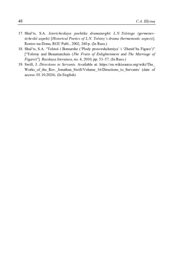 18. Shul’ts, S.A. “Tolstoi i Bomarshe (‘Plody prosveshcheniya’ i ‘Zhenit’ba Figaro’)” [“Tolstoy and Beaumarchais (The Fruits of Enlightenment and The Marriage of Figaro)”]. Russkaya literatura, no. 4, 2010, pp. 53–57. (In Russ.)