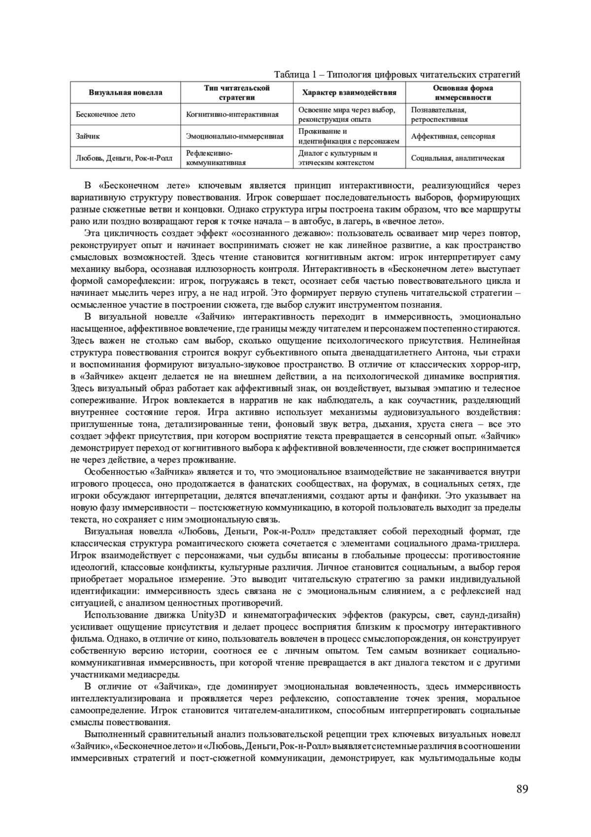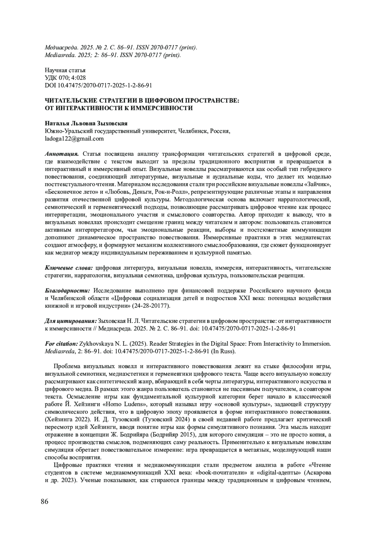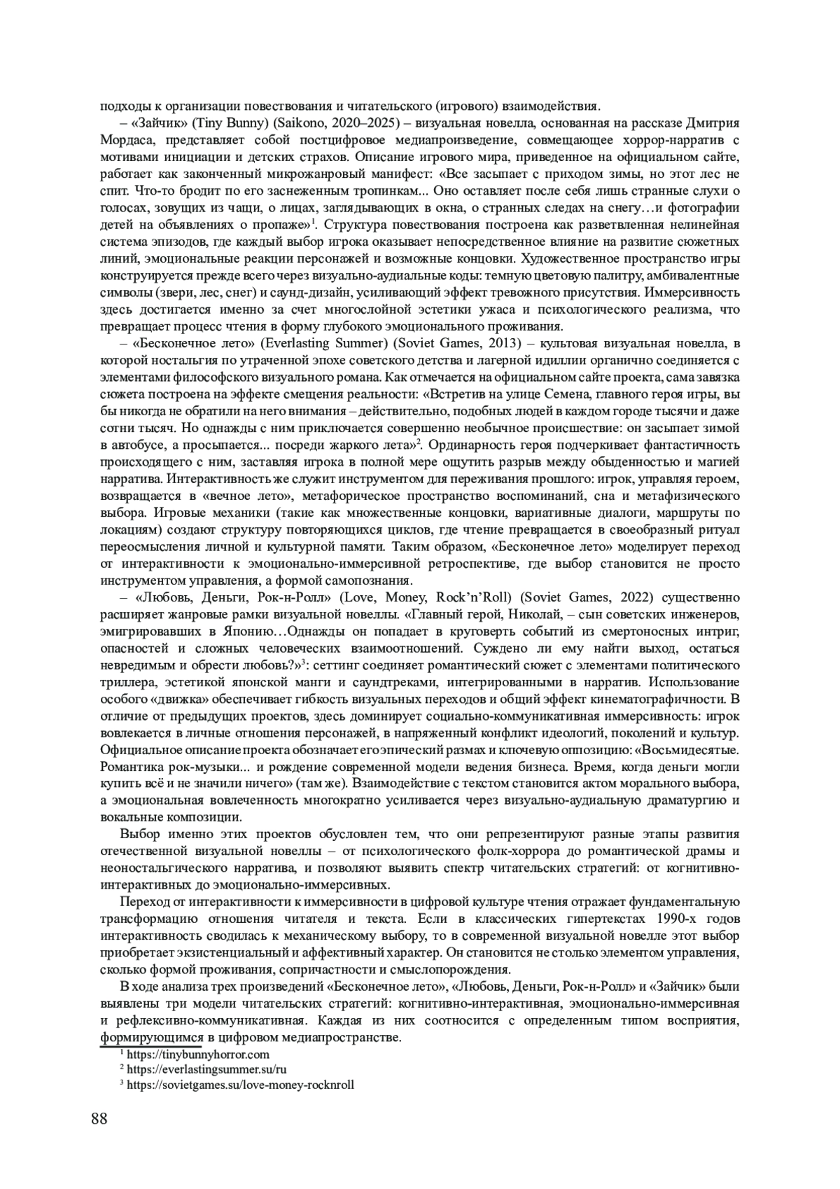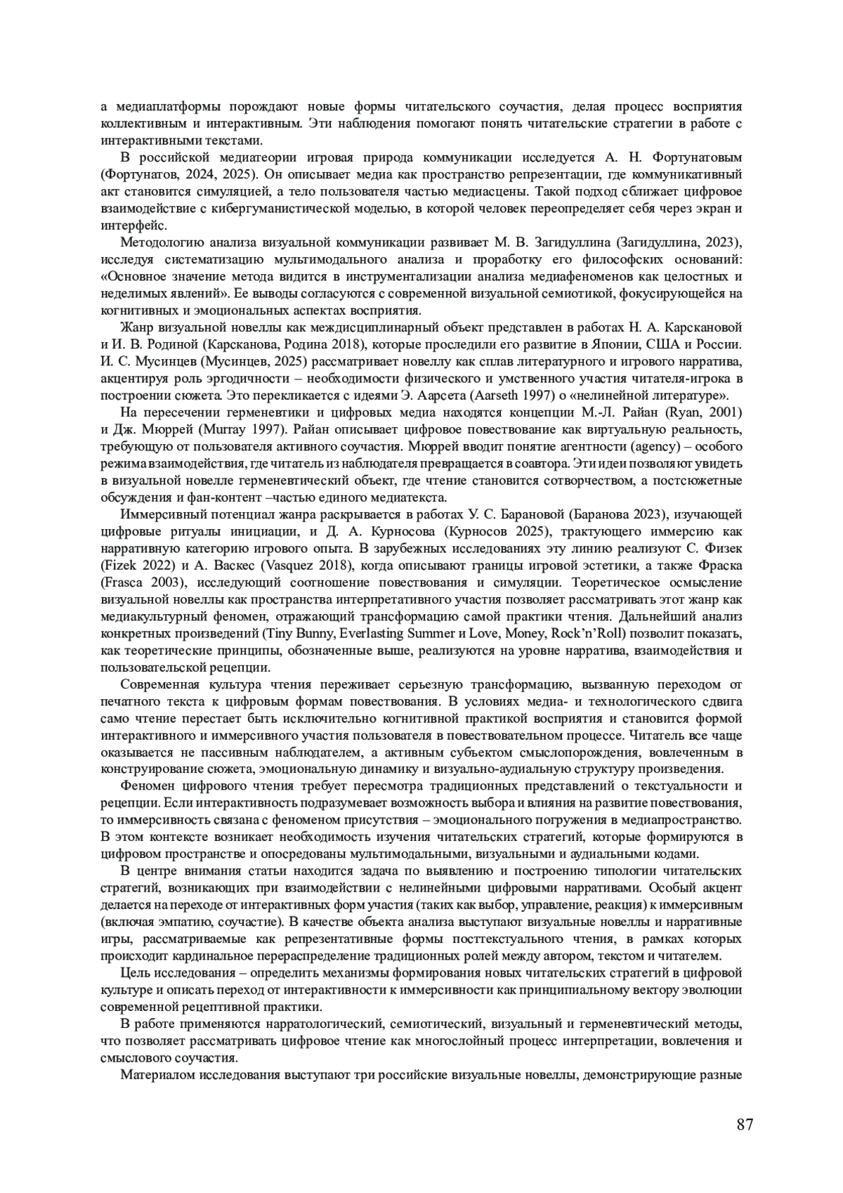 Статья посвящена анализу трансформации читательских стратегий в цифровой среде, где взаимодействие с текстом выходит за пределы традиционного восприятия и превращается в интерактивный и иммерсивный опыт. Визуальные новеллы рассматриваются как особый тип гибридного повествования, соединяющий литературные, визуальные и аудиальные коды, что делает их моделью посттекстуального чтения. Материалом исследования стали три российские визуальные новеллы «Зайчик»,«Бесконечное лето» и «Любовь, Деньги, Рок-н-Ролл», репрезентирующие различные этапы и направления развития отечественной цифровой культуры. Методологическая основа включает нарратологический, семиотический и герменевтический подходы, позволяющие рассматривать цифровое чтение как процесс интерпретации, эмоционального участия и смыслового соавторства. Автор приходит к выводу, что в визуальных новеллах происходит смещение границ между читателем и автором: пользователь становится активным интерпретатором, чьи эмоциональные реакции, выборы и постсюжетные коммуникации дополняют динамическое пространство повествования. Иммерсивные практики в этих медиатекстах создают атмосферу, и формируют механизм коллективного смыслообразования, где сюжет функционирует как медиатор между индивидуальным переживанием и культурной памятью.