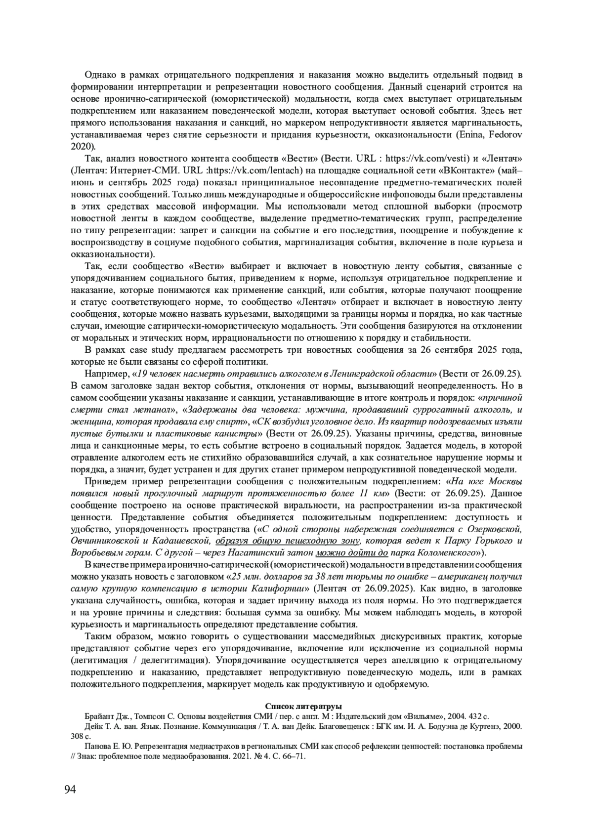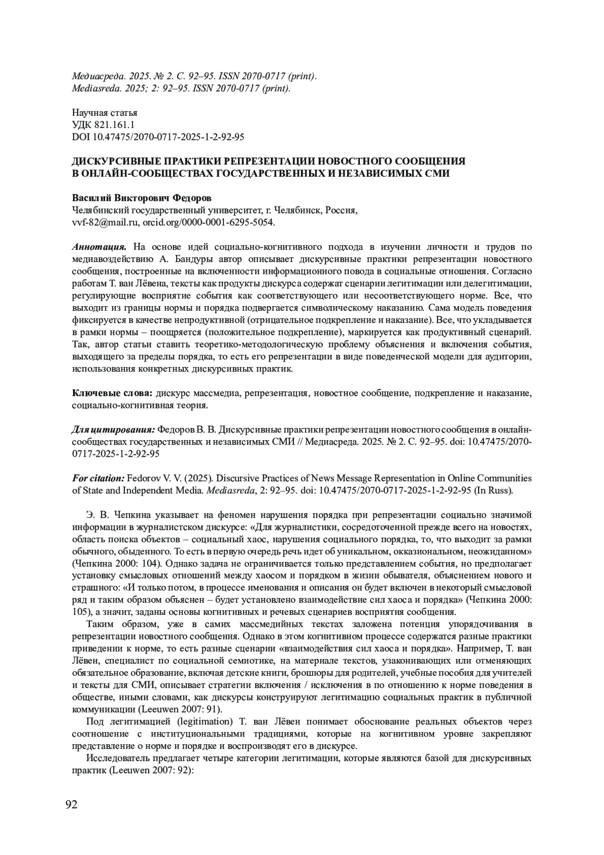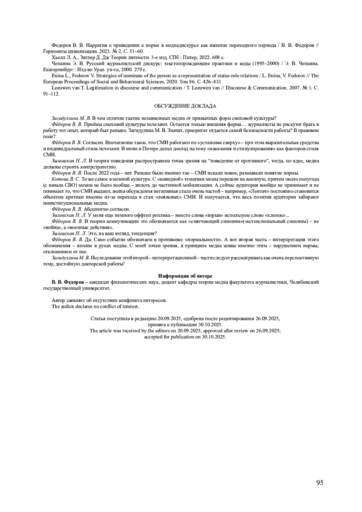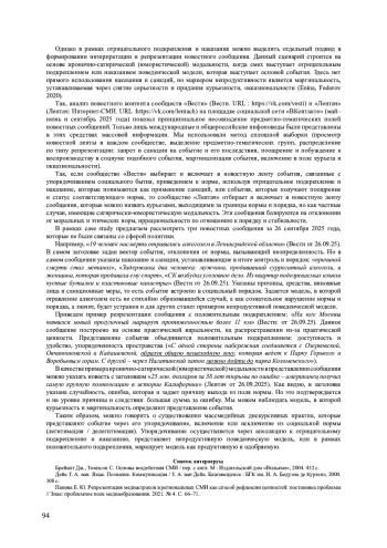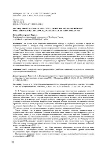 4. Федоров В. В. Нарратив о приведении к норме в медиадискурсе как явление переходного периода // Горизонты цивилизации. 2023. № 2. С. 51-60.
