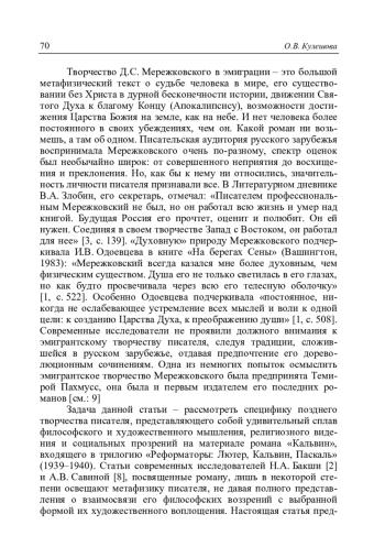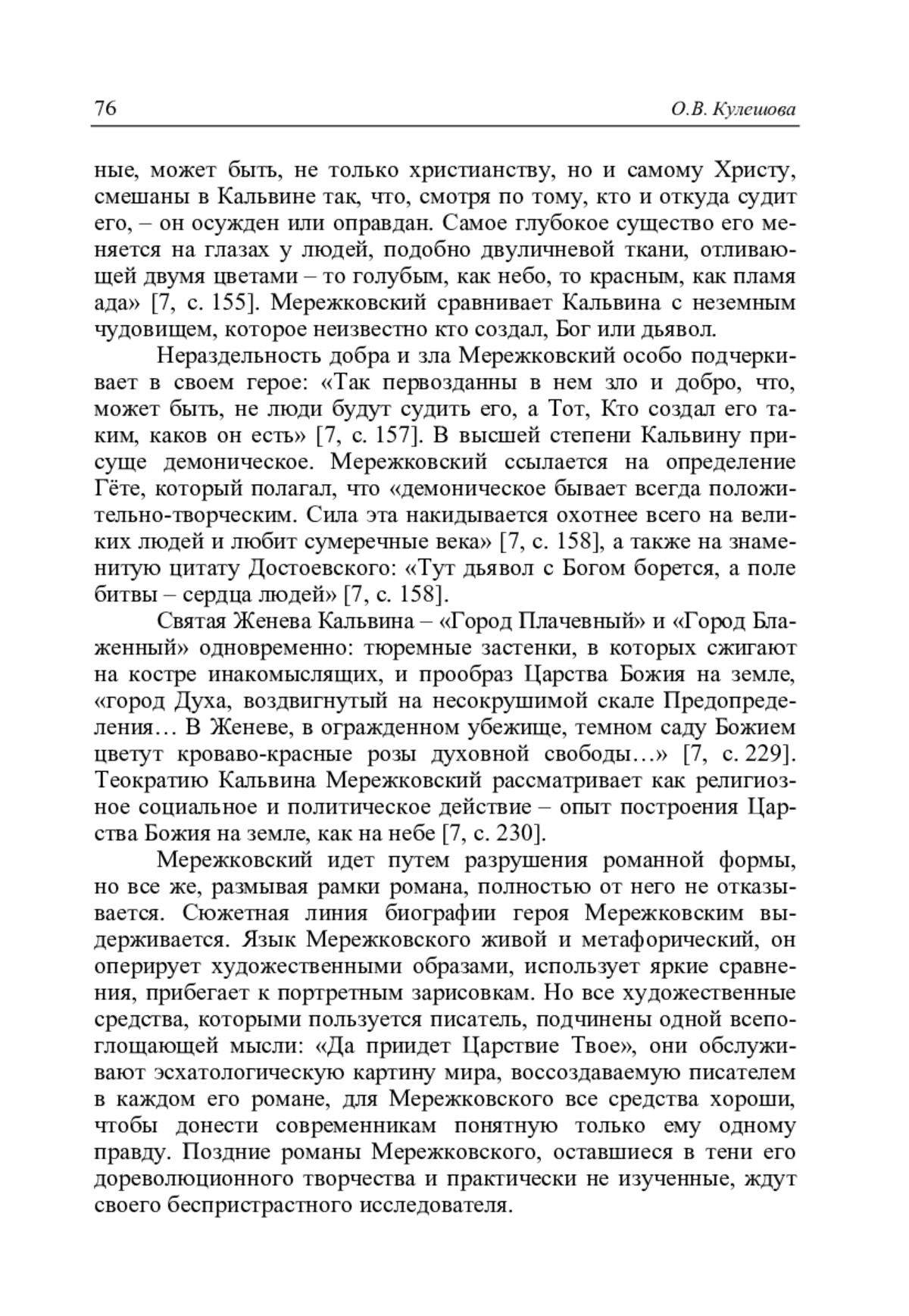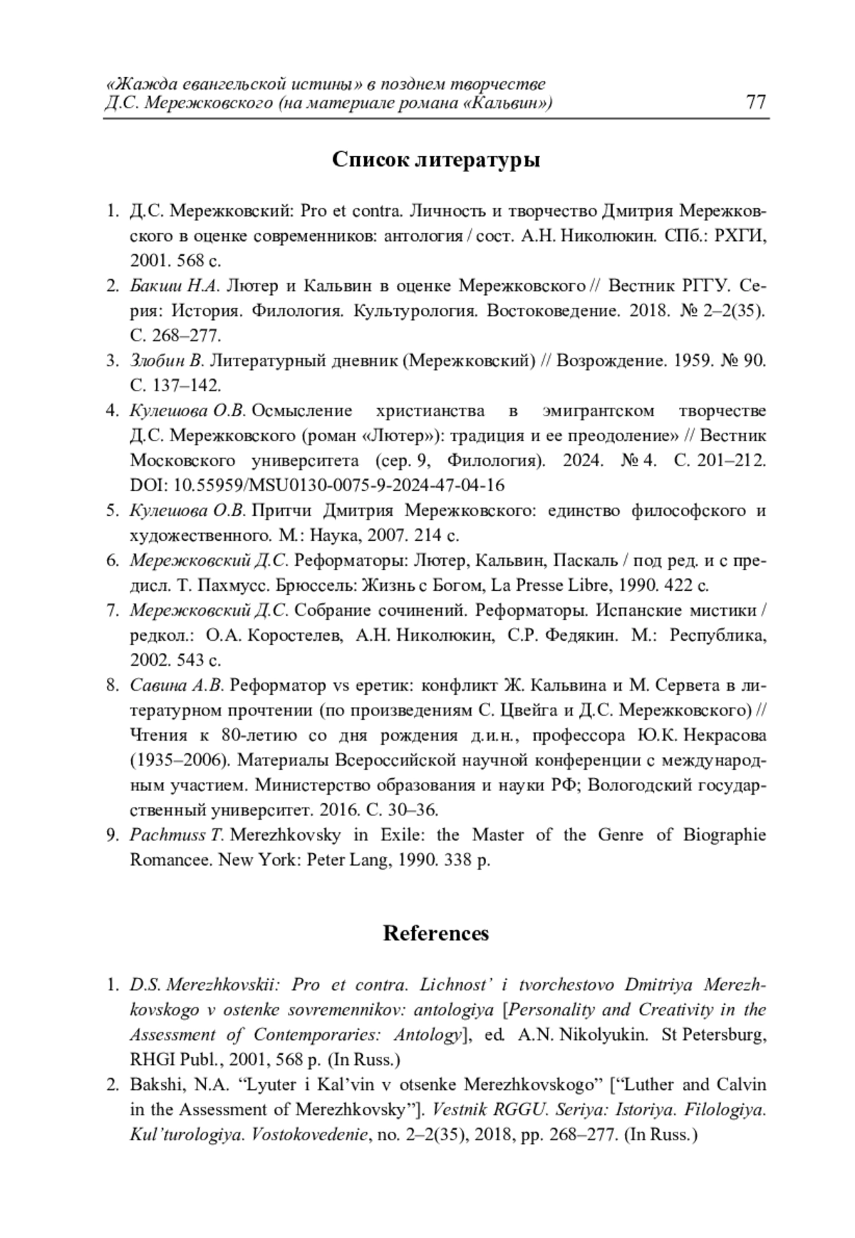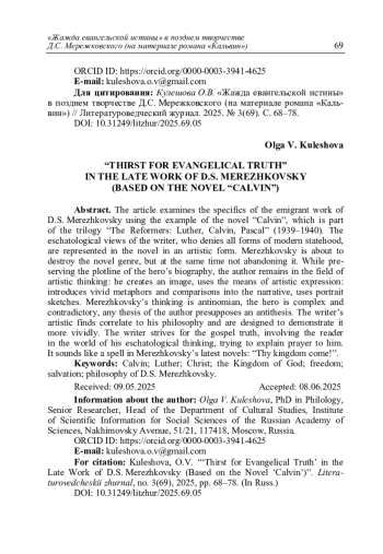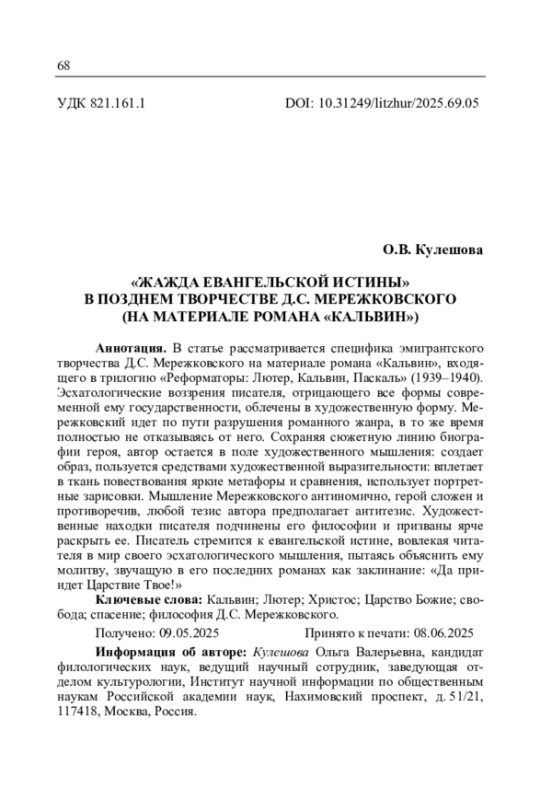 Кулешова О.В. «Жажда евангельской истины» в позднем творчестве Д.С. Мережковского (на материале романа «Кальвин») // Литературоведческий журнал. 2025. No 3(69). С. 68–78.