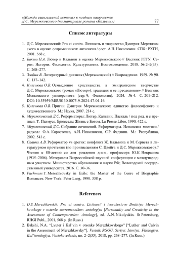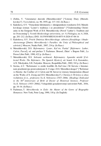 4. Kuleshova, O.V. “Osmyslenie khristianstva v ehmigrantskom tvorchestve D.S. Merezhkovskogo (roman ‘Lyuter’): traditsiya i ee preodolenie” [“Understanding Christianity in the Emigrant Work of D.S. Merezhkovsky (Novel ‘Luther’): Tradition and its Overcoming”]. Vestnik Moskovskogo universiteta, ser. 9, Filologiya, no. 4, 2024,