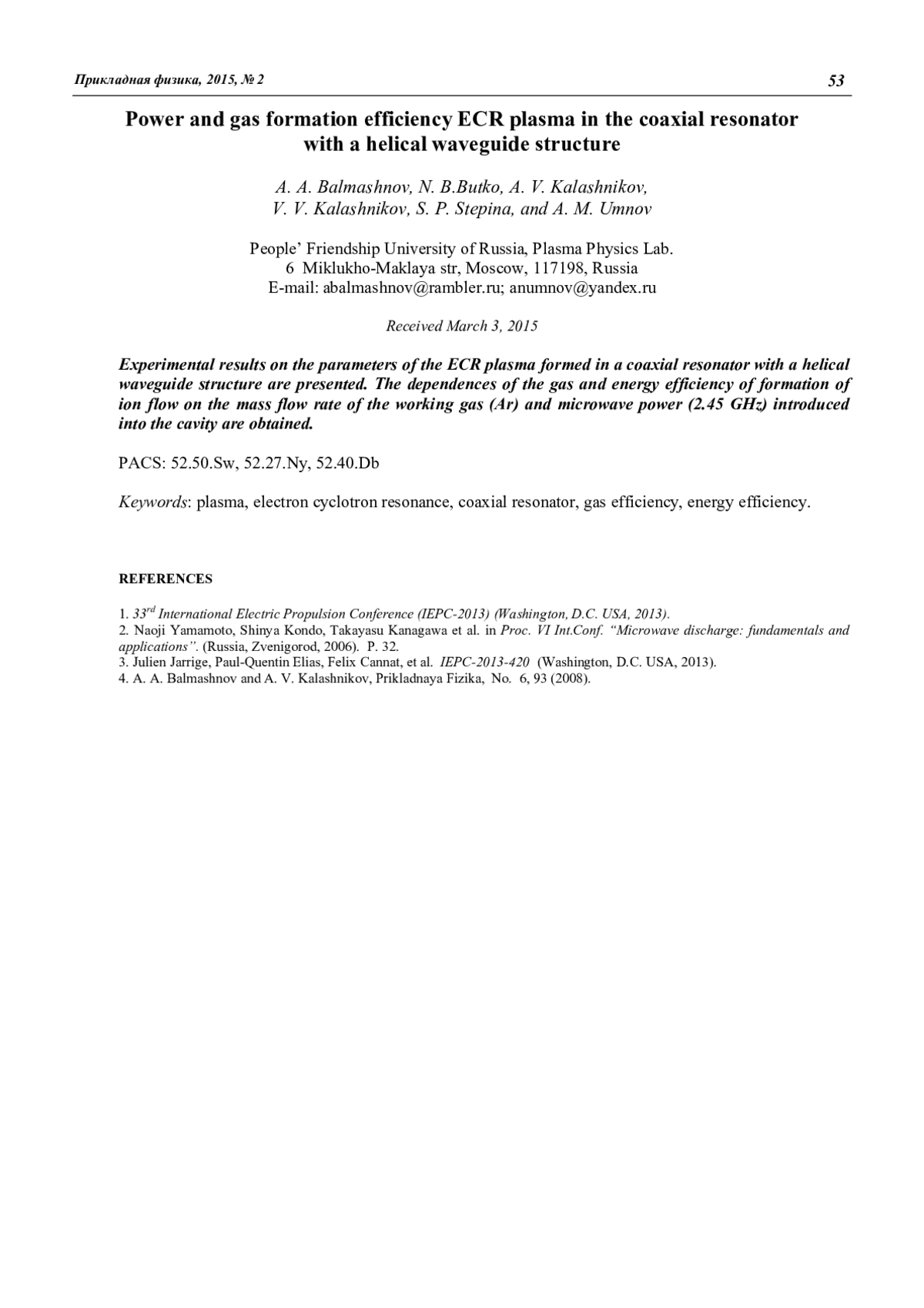 A. A. Balmashnov, N. B. Butko, A. V. Kalashnikov, V. V. Kalashnikov, S. P. Stepina, and A. M. Umnov Power and gas formation efficiency ECR plasma in the coaxial resonator with a helical waveguide structure 50