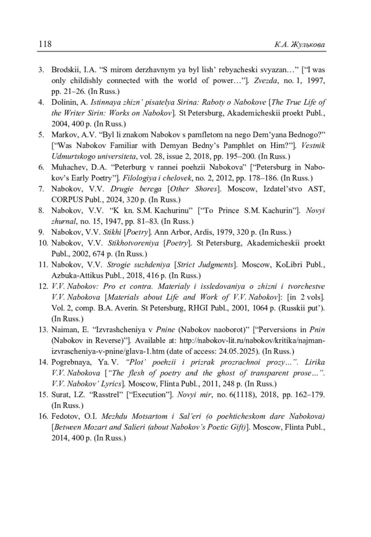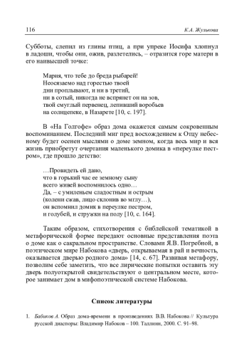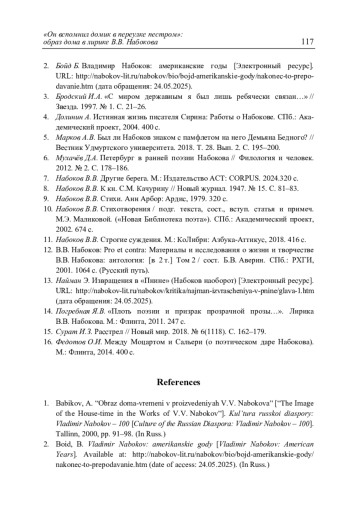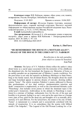 Жулькова К.А. «Он вспомнил домик в переулке пестром»: образ дома в лирике В.В. Набокова // Литературоведческий журнал. 2025. No 3(69). С. 97–118.