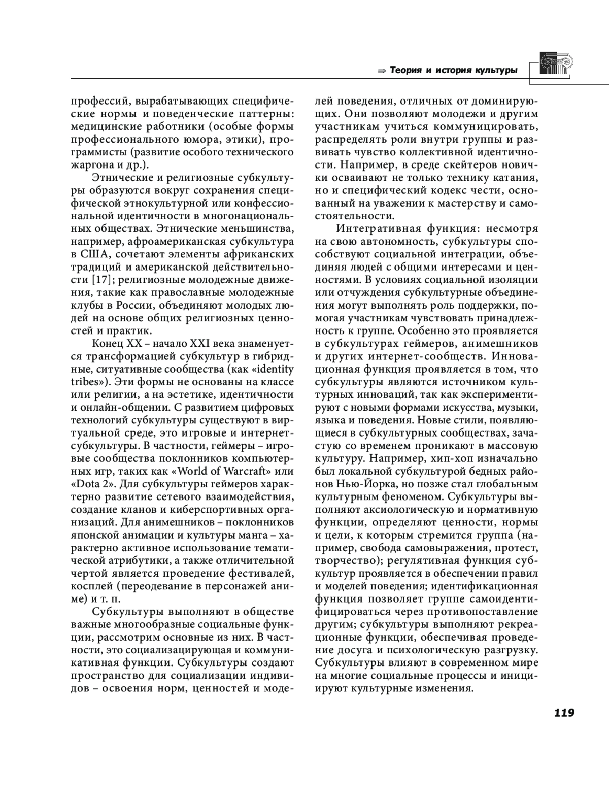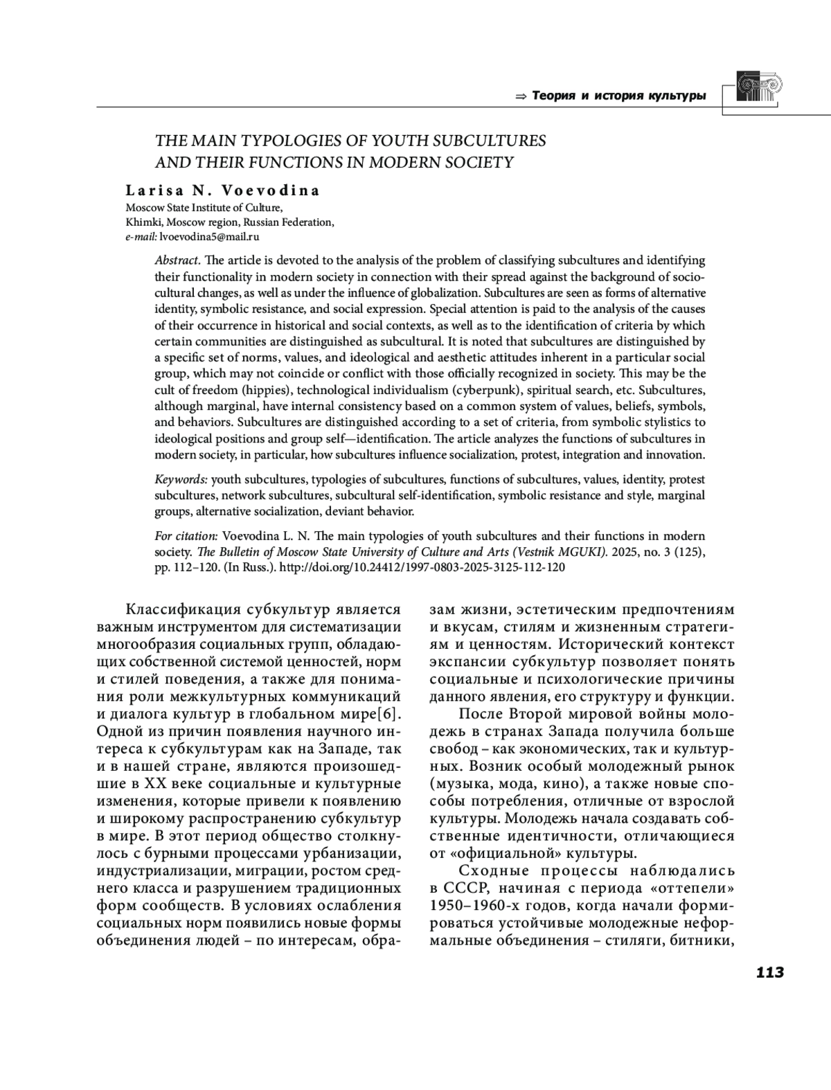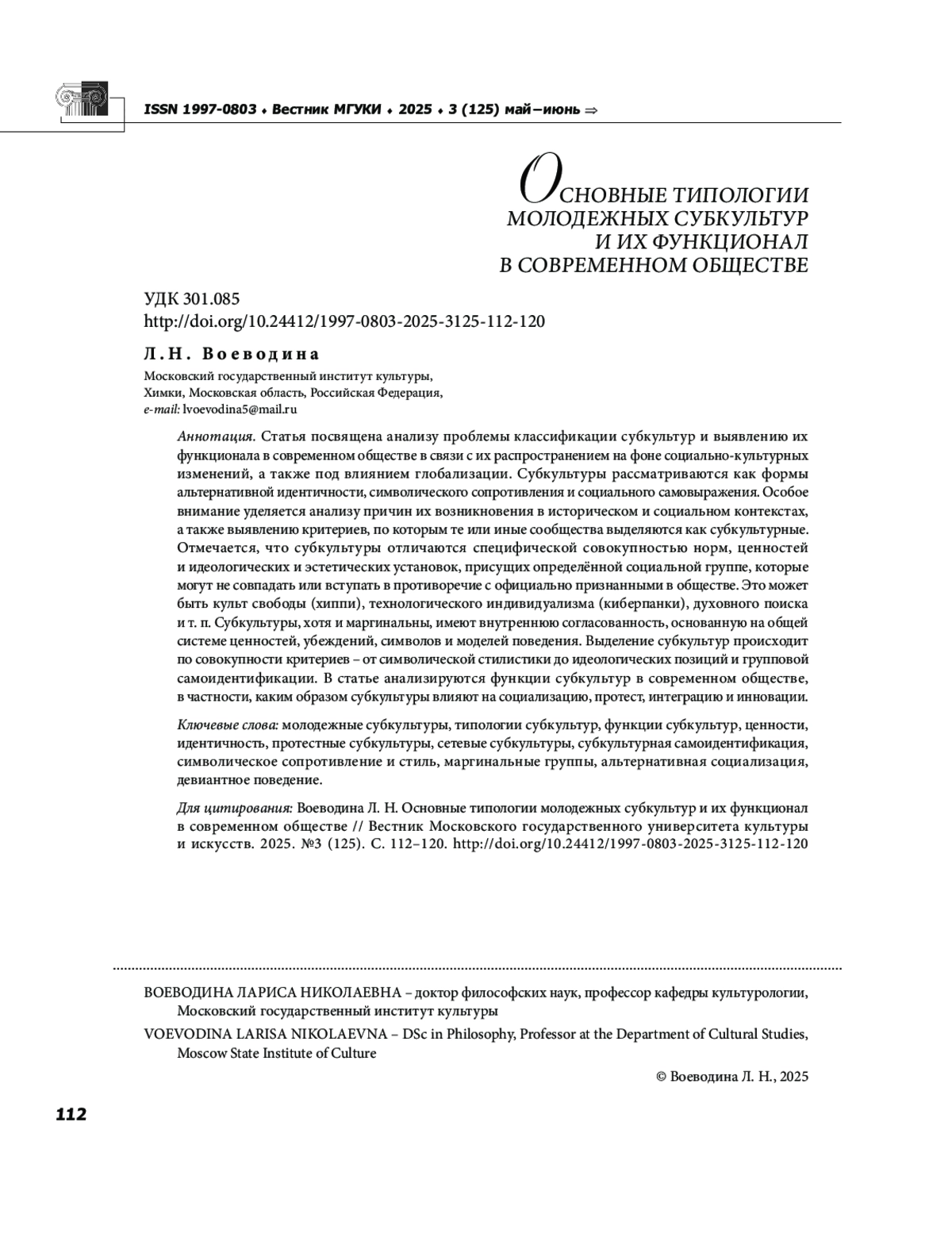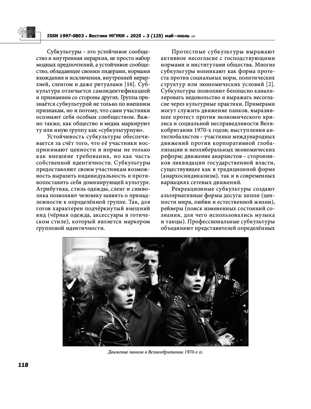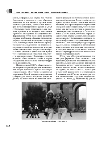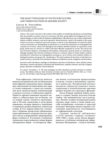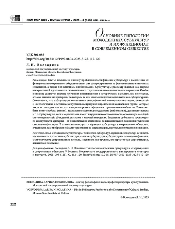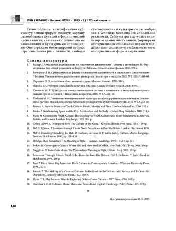 2. Воеводина Л. Н. Субкультуры как формы коллективной идентичности и социального сопротивления // Вестник Московского государственного университета культуры и искусств. 2025. № 2 (124). С. 60-68. EDN: YHZSXL