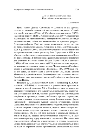 The article examines audio productions of fairy tale plays by David Samoilov with music by Boris Tchaikovsky (The Little Elephant Went to Study, The Little Elephant Tourist, Puss in Boots etc.), created by director Antonida Ilyina and released from 1954 to 1978, first on the All-Union radio and then on gramophone records. Samoilov’s plays, written especially for radio, brought new intonations to the style of children’s radio plays, characteristic of the cultural phenomena of the thaw, and, enriched with Tchaikovsky’s music, became a kind of transition from the academic tradition of musical and literary compositions to the emerging genre of children’s musicals. The hidden moral background present in all the tales of the cycle is analyzed, their conflict is revealed, and parallels are drawn between Samoilov’s comedy of everyday masks and the Italian commedia dell’arte. The history and evolution of the joint works of Samoilov and Tchaikovsky are traced; their stylistic uniqueness and artistic features are noted.
