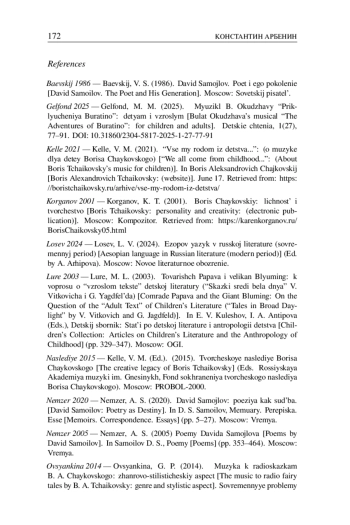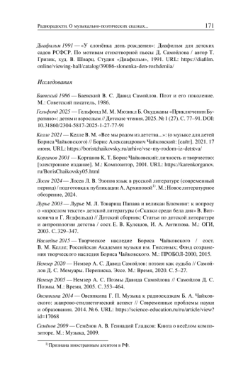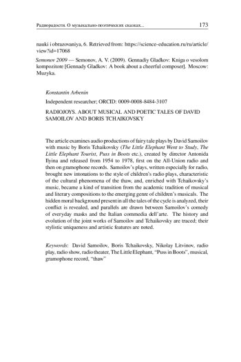 10. Овсянкина Г. П. Музыка к радиосказкам Б. А. Чайковского: жанрово-стилистический аспект // Современные проблемы науки и образования. 2014. № 6. URL: https://science- education.ru/ru/article/view? идентификатор = 17068. EDN: TGRHIR