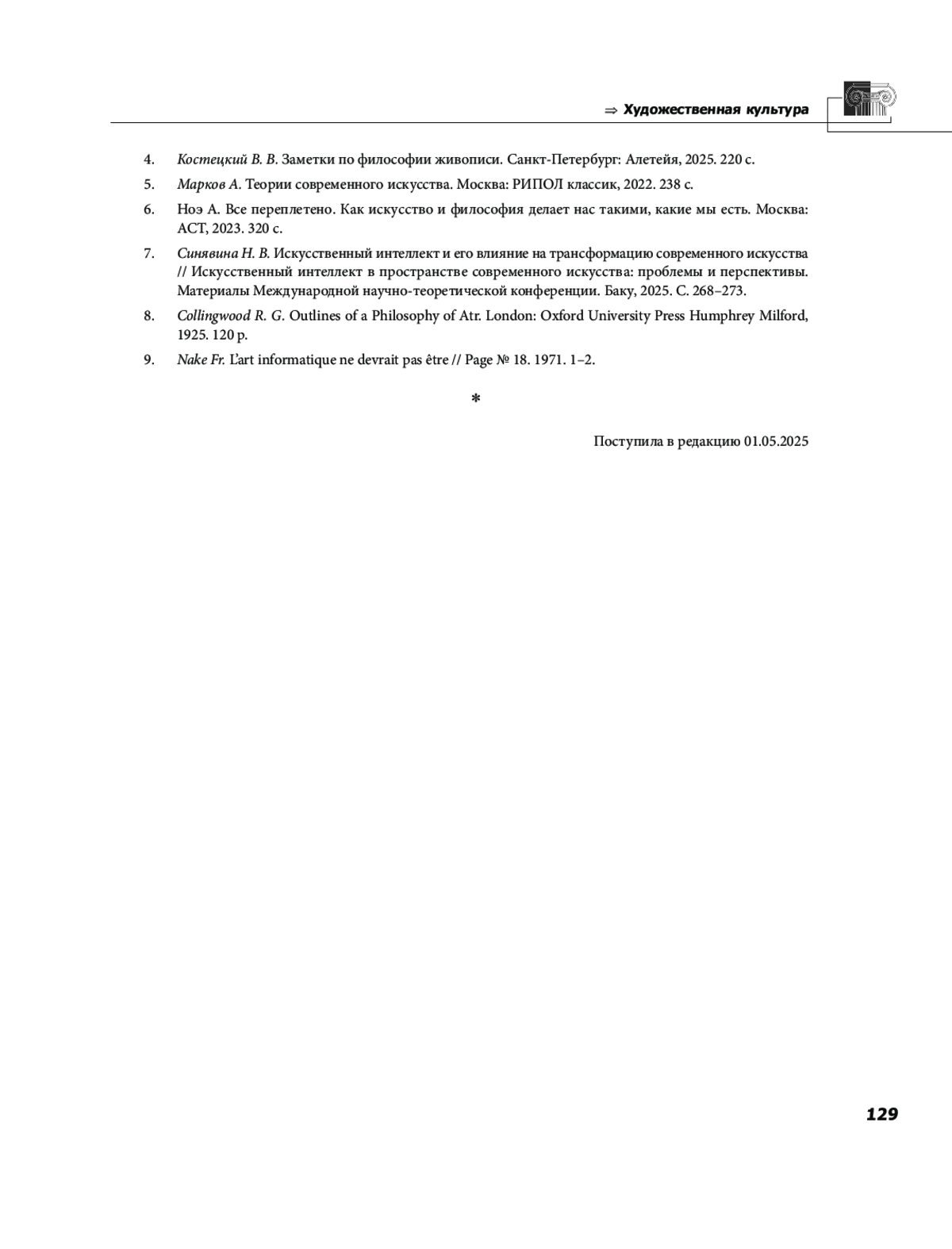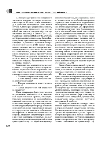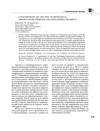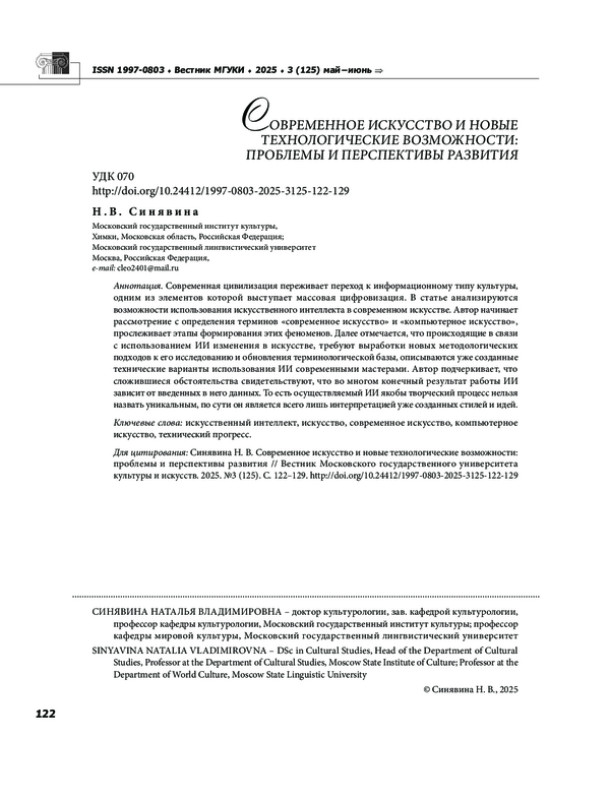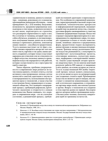 7. Синявина Н. В. Искусственный интеллект и его влияние на трансформацию современного искусства // Искусственный интеллект в пространстве современного искусства: проблемы и перспективы. Материалы Международной научно-теоретической конференции. Баку, 2025. С. 268-273.