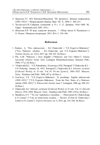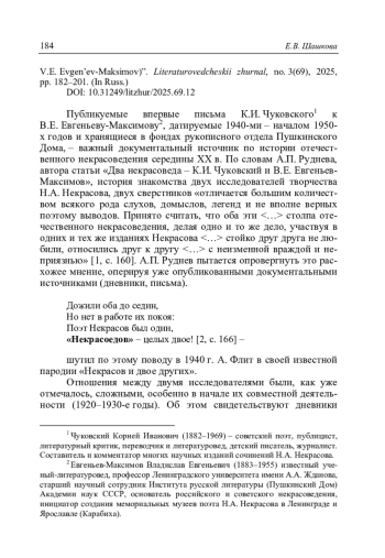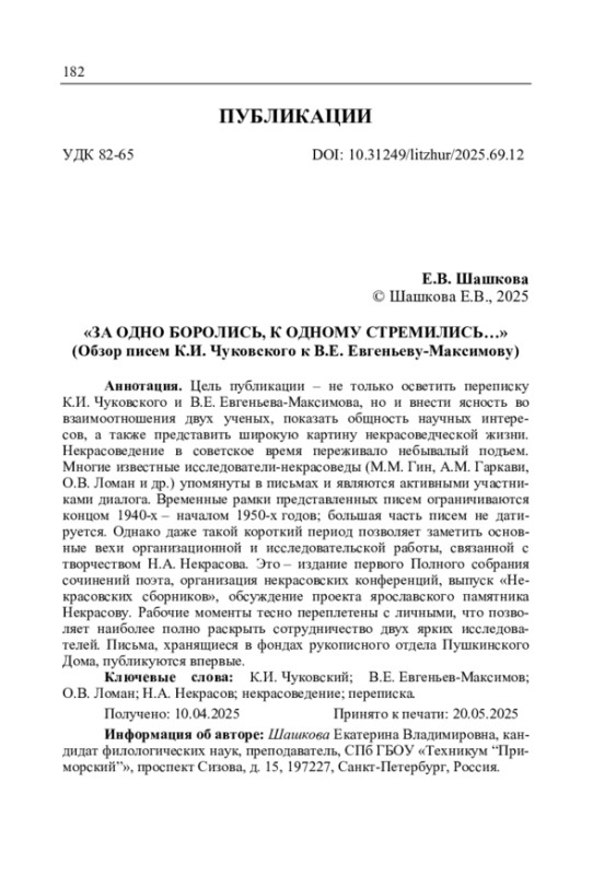 Шашкова Е.В. «За одно боролись, к одному стремились…» (Обзор писем К.И. Чуковского к В.Е. Евгеньеву-Максимову) // Литературоведческий журнал. 2025. No 3(69). С. 182–201.