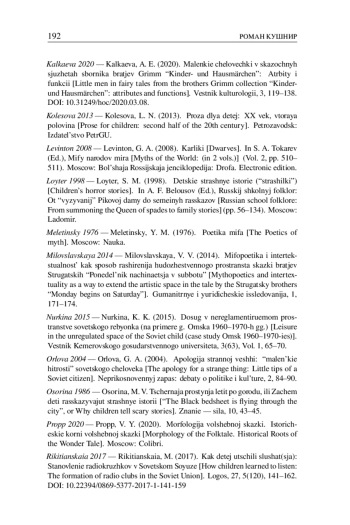 The article addresses the representations of radio equipment in two late Soviet children’s fairy stories: The Little Warranty People (1974) by Eduard Uspensky and A Tale of True and False Friendship (1980) by Arkady and Boris Strugatsky. In these texts, different radios (a radio phonograph, a transistor radio) are portrayed as having agency and act as a plot-forming element. The aim of this article is to identify the features of creating the imagery of the radios, with a special emphasis on the analysis of what fundamental folklore and mythological sources can be found in the structure of this imagery. The article demonstrates that the image of these radios has a complex synthetic character. The authors combine and creatively reinterpret the elements from Russian and West European myths and tales, modernize them and bring them to the Soviet reality. The writers also incorporate these elements with Soviet childlore and folklore and give them new Soviet meanings. In the imagery of radio equipment, an essential part of Soviet (children’s) everyday life, there is also the “adult” content plan which emphasizes dual address of these fairy stories.