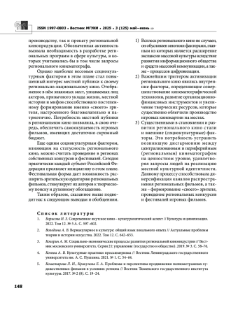 7. Кравченко К. А., Московчук Л. С. Традиции и современность в региональном кинематографе (на примере женских образов) // Парадигма: философско-культурологический альманах. 2023. № 39. С. 120- 126. EDN: ATAXBD