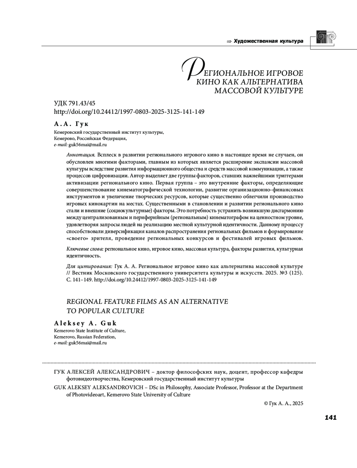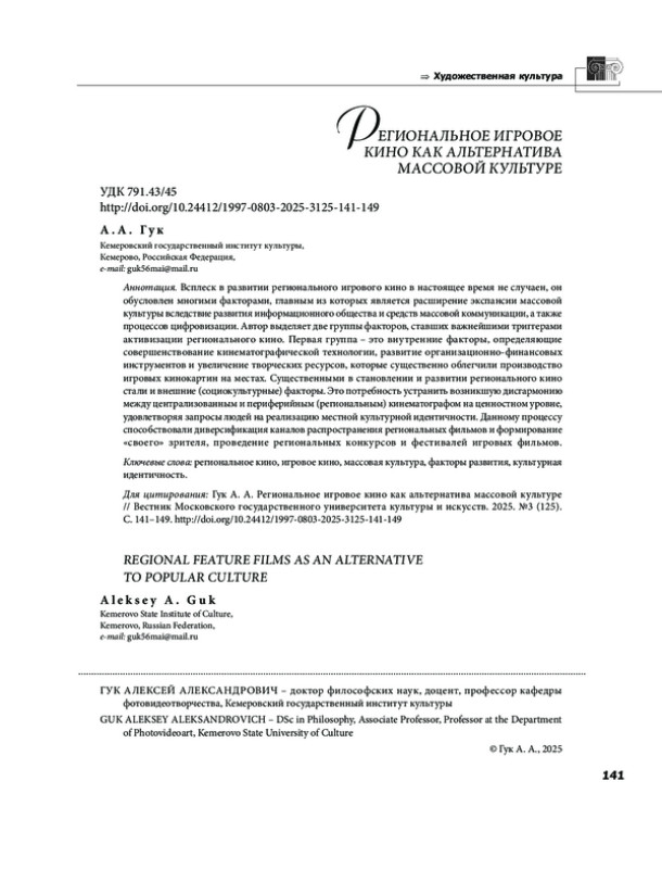 6. Кравченко К. А. Региональное кино России: к проблеме определения // Парадигма: философскокультурологический альманах. 2022. № 36. С. 139-149. EDN: OEZURQ