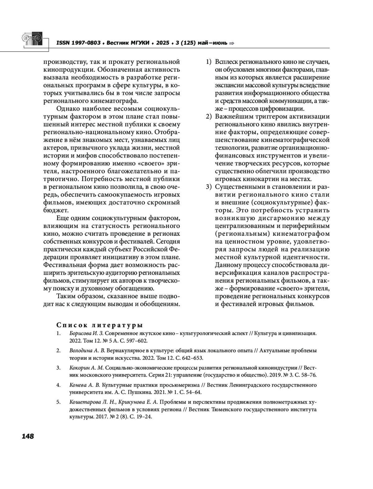 3. Кокорин А. М. Социально-экономические процессы развития региональной киноиндустрии // Вестник московского университета. Серия 21: управление (государство и общество). 2019. № 3. С. 58-76. EDN: IJTGPB